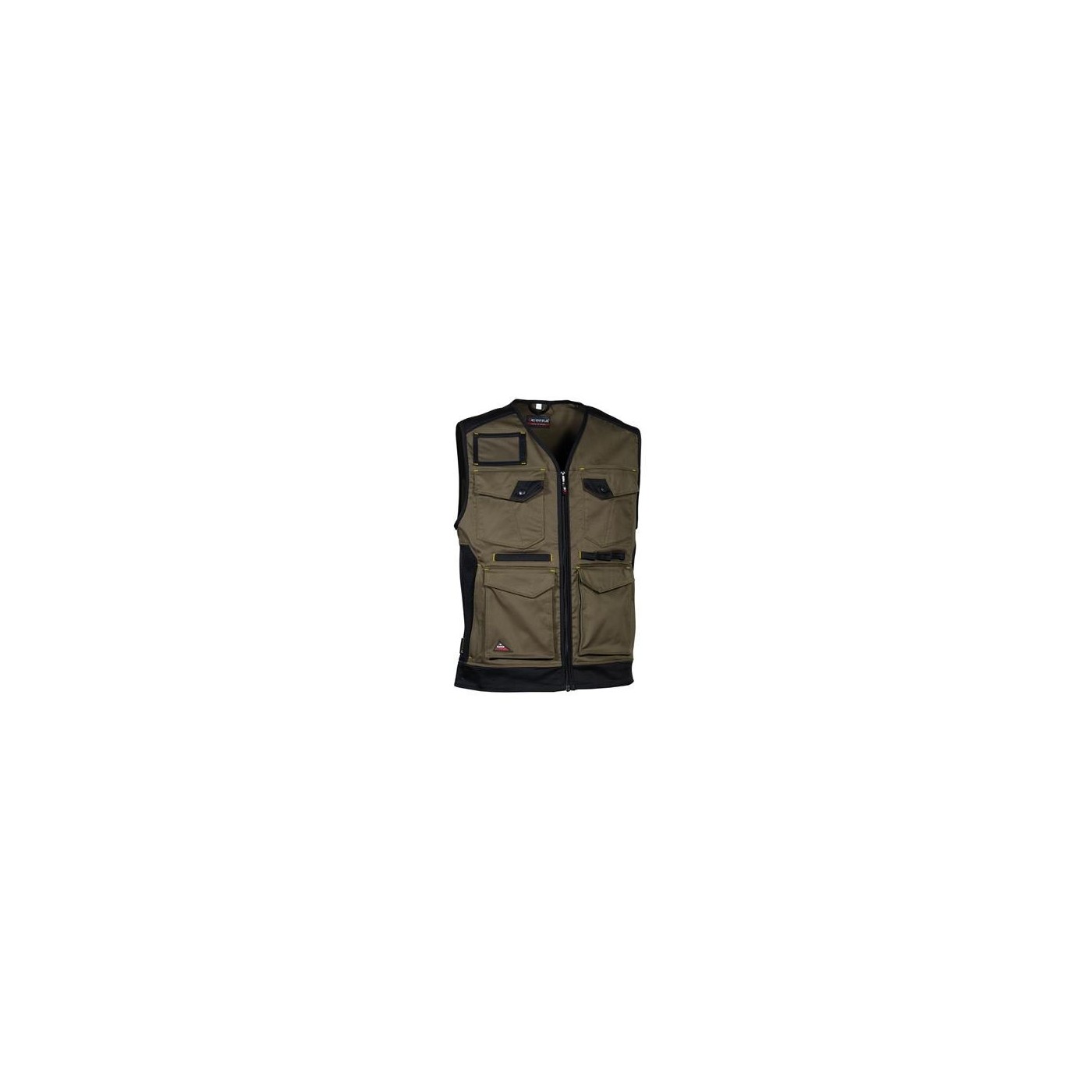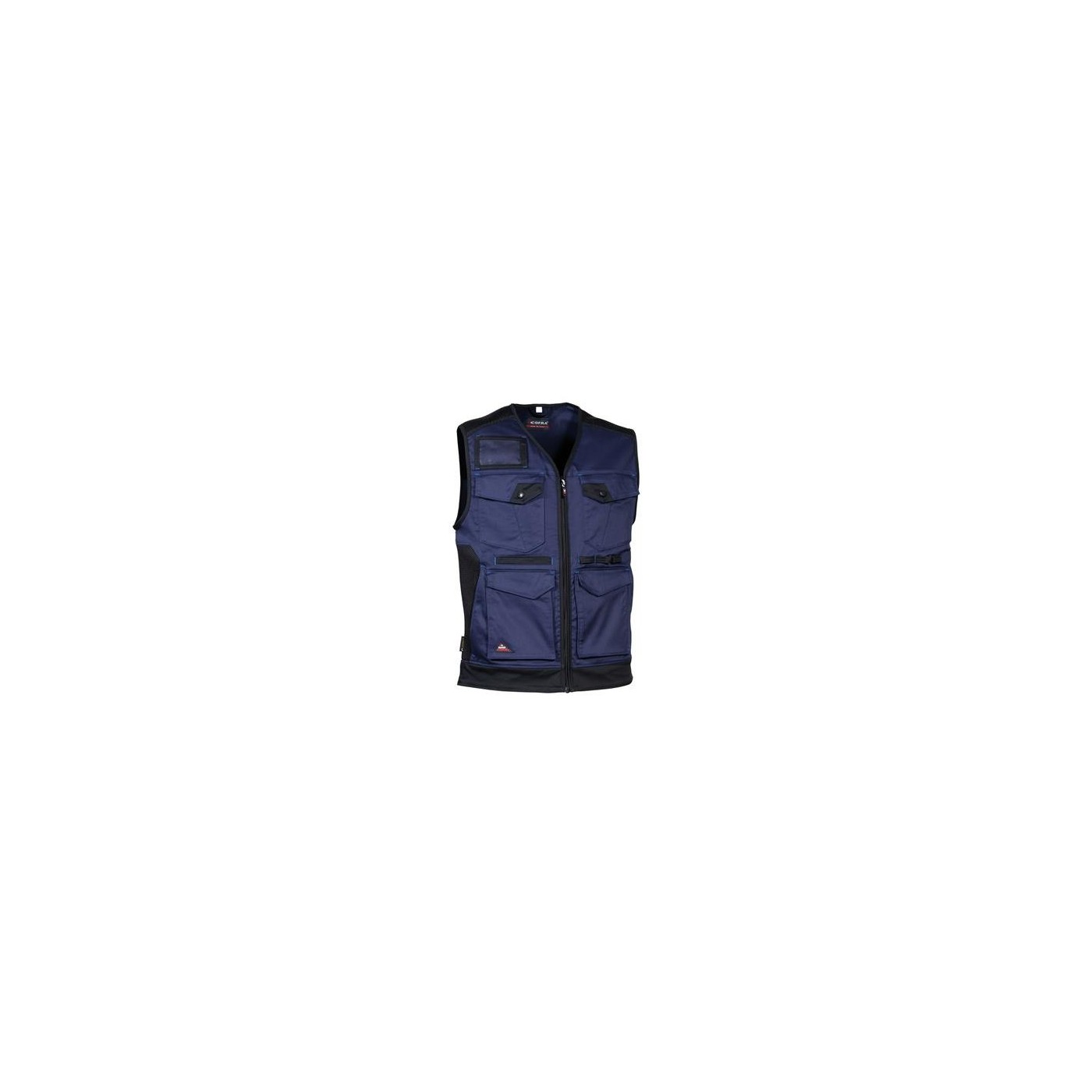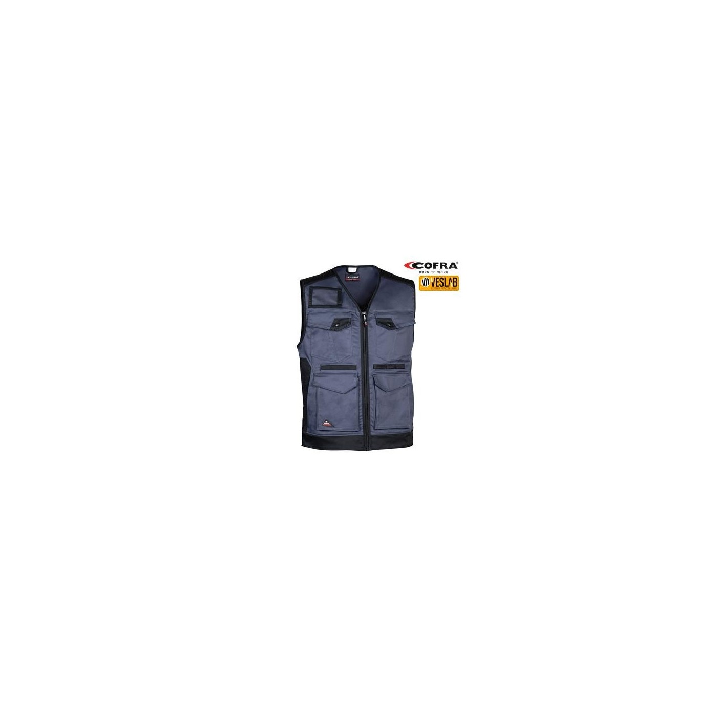 Chaleco multibolsillos de trabajo industrial Cofra de tejido elástico. Dispone de dos bolsillos delanteros cerrados con broche, abertura central con cremallera, amplios bolsillos interiores y bolsillo portamóvil en el pecho con tejido E-WARD. Incorpora un anillo porta tarjeta con snap, bolsillo en el pecho con solapa cerrada con broches y solapa protector de barbilla.
