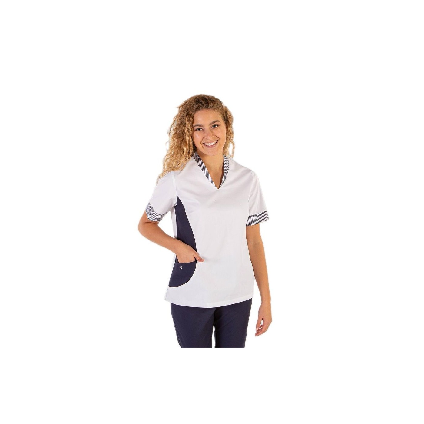La Blusa Noemí está confeccionada en sarga blanca, un tejido duradero y de alta calidad. Destaca con detalles en vichy de rayas en el cuello y las bocamangas, añadiendo un toque de estilo a la prenda. Su diseño versátil la convierte en la elección ideal para profesionales de la salud que trabajan en hospitales, clínicas, centros médicos, veterinarios y servicios de limpieza.