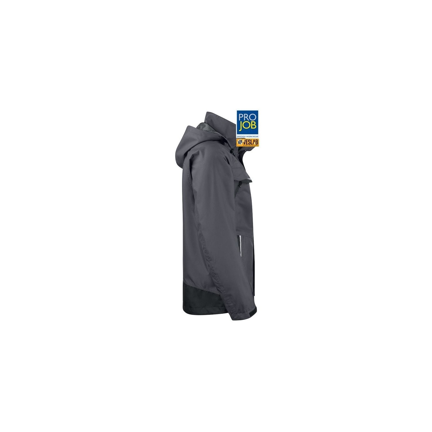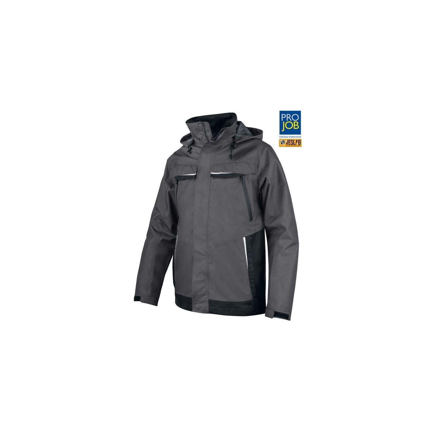Chaqueta de trabajo Projob con acolchado resistente al viento y al agua, con costuras selladas para mayor durabilidad. Dispone de una cremallera frontal con solapa que evita la penetración de agua, cierre a presión para mayor seguridad. Cuenta con bolsillos dobles en la parte frontal: dos con solapa y cierre de Velcro, y dos con cremalleras resistentes al agua. La parte izquierda está especialmente diseñada para llevar tarjeta identificativa. Además, tiene bolsillos laterales con cremallera y forro polar. En su interior, cuenta con tres bolsillos espaciosos, dos de ellos con cremallera. La capucha es ajustable y desmontable mediante cordón. Los puños son ajustables con Velcro, y la cintura se puede ajustar mediante cordón. El forro se abre fácilmente, lo que facilita la personalización mediante bordado o cualquier tipo de impresión.