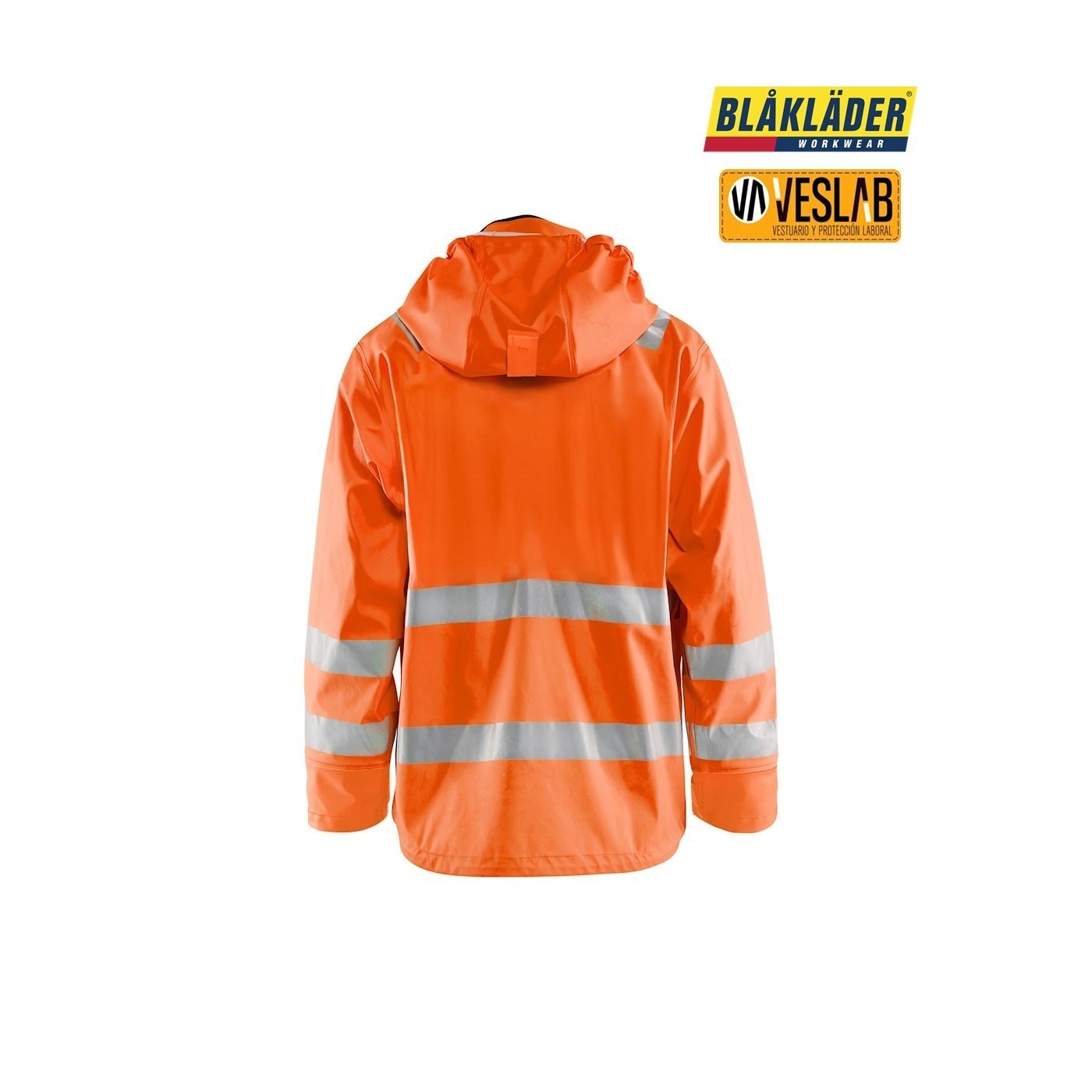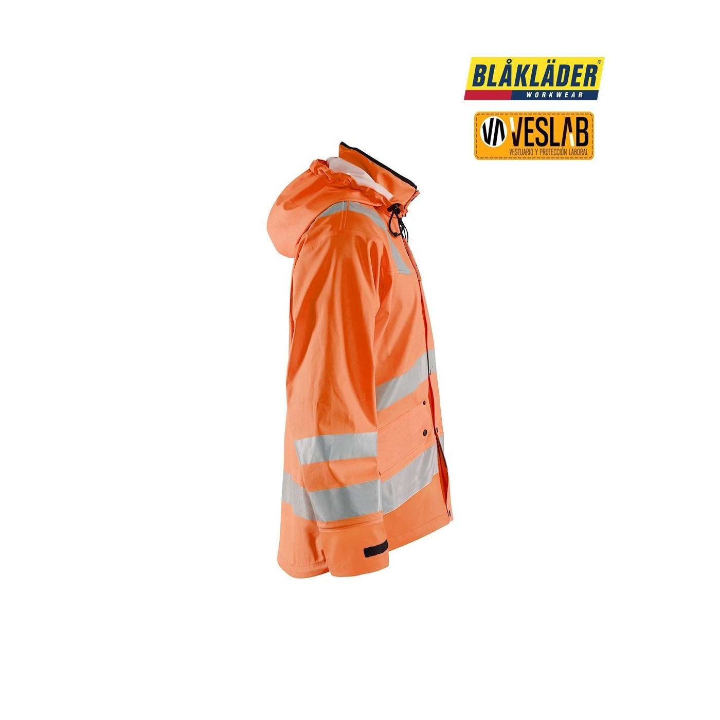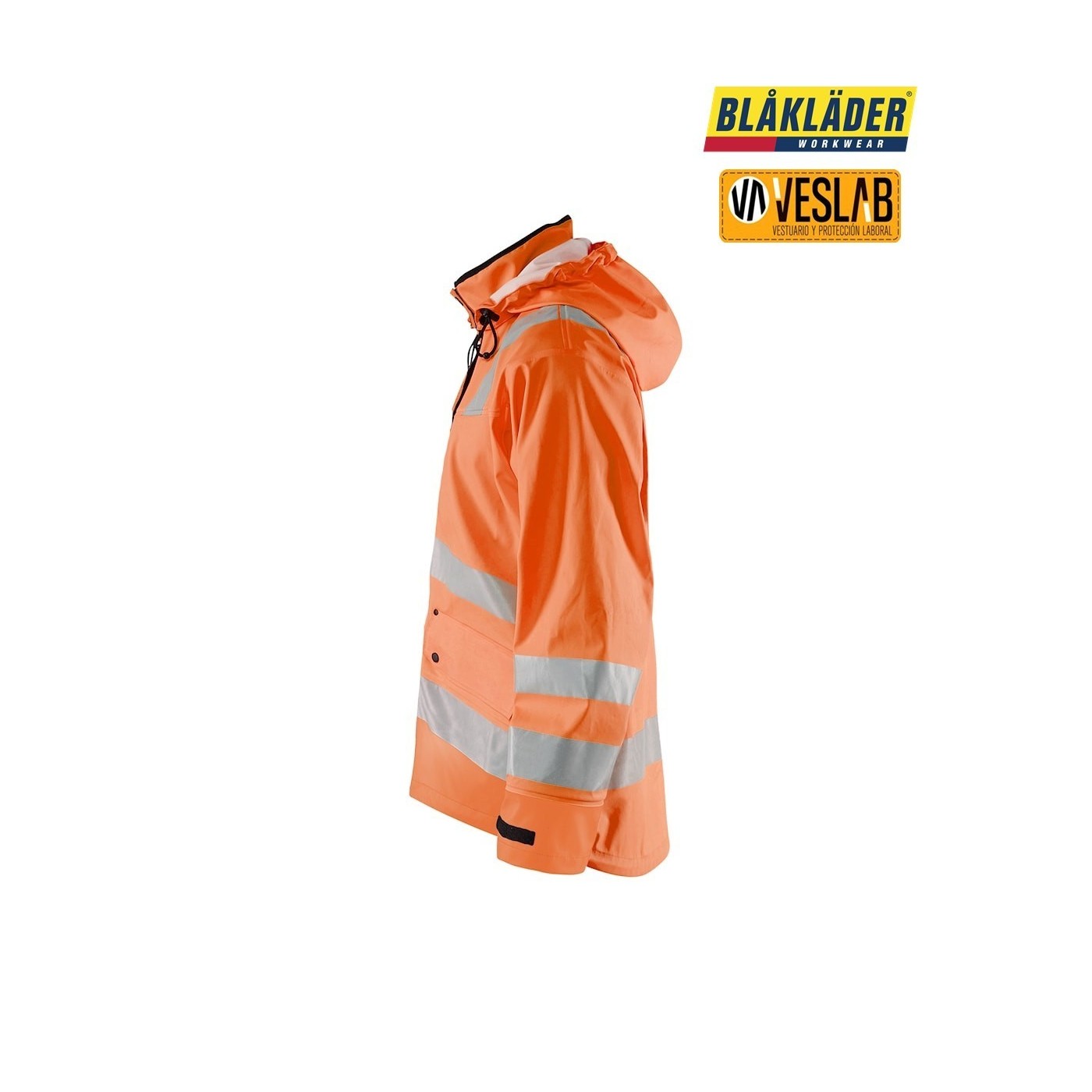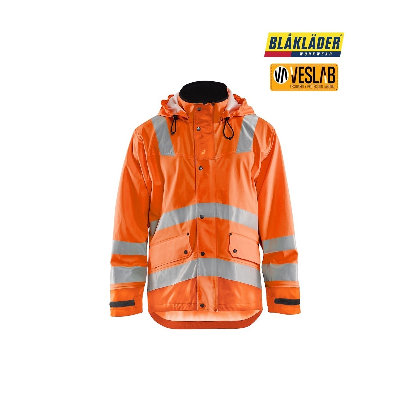 La chaqueta impermeable de alta visibilidad Nivel 3 de Blåkläder es perfecta para condiciones climáticas extremas. Está hecha de 100% poliéster, con un revestimiento de PVC/PU que la hace resistente al viento y al agua. Además, es transpirable y cuenta con costuras selladas. Tiene una capucha desmontable y compatible con casco, cierre delantero con cremallera bidireccional oculta y botones antilluvia. También cuenta con bolsillos delanteros con solapa, bolsillo Napoleón en el interior y elementos reflectantes de anchos diferentes. Es una chaqueta funcional y durable.
