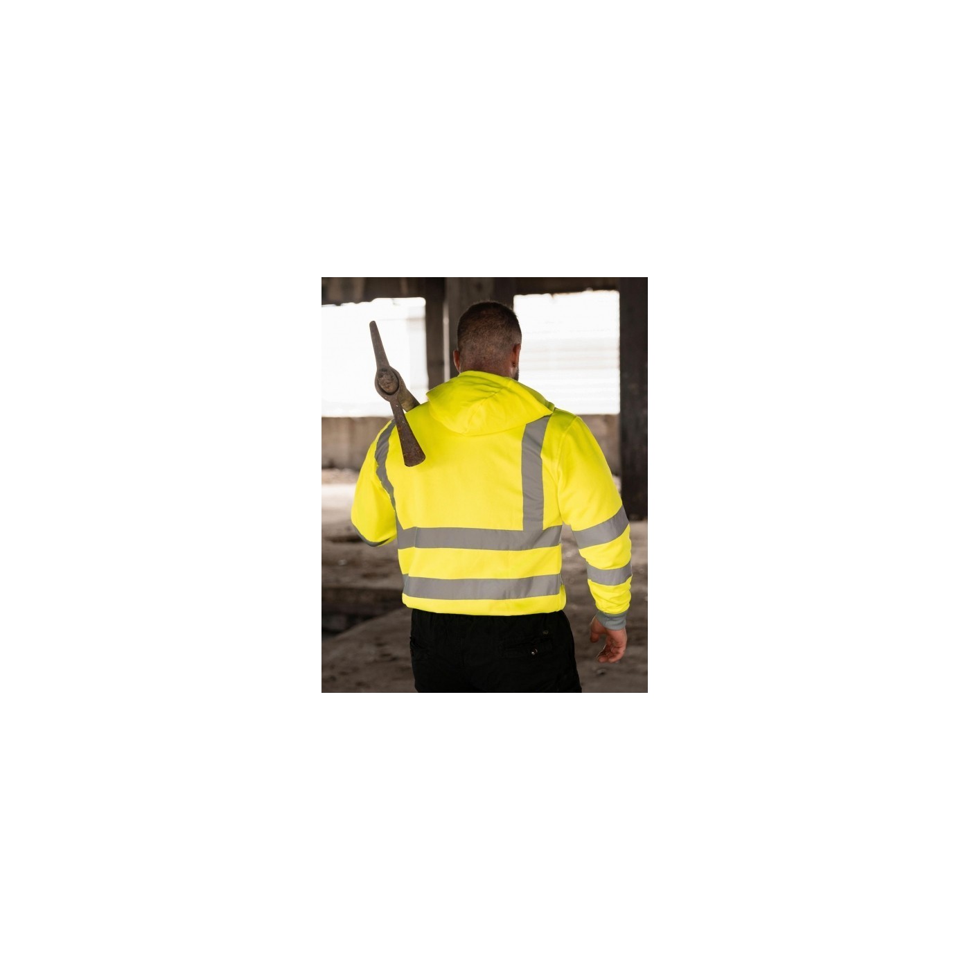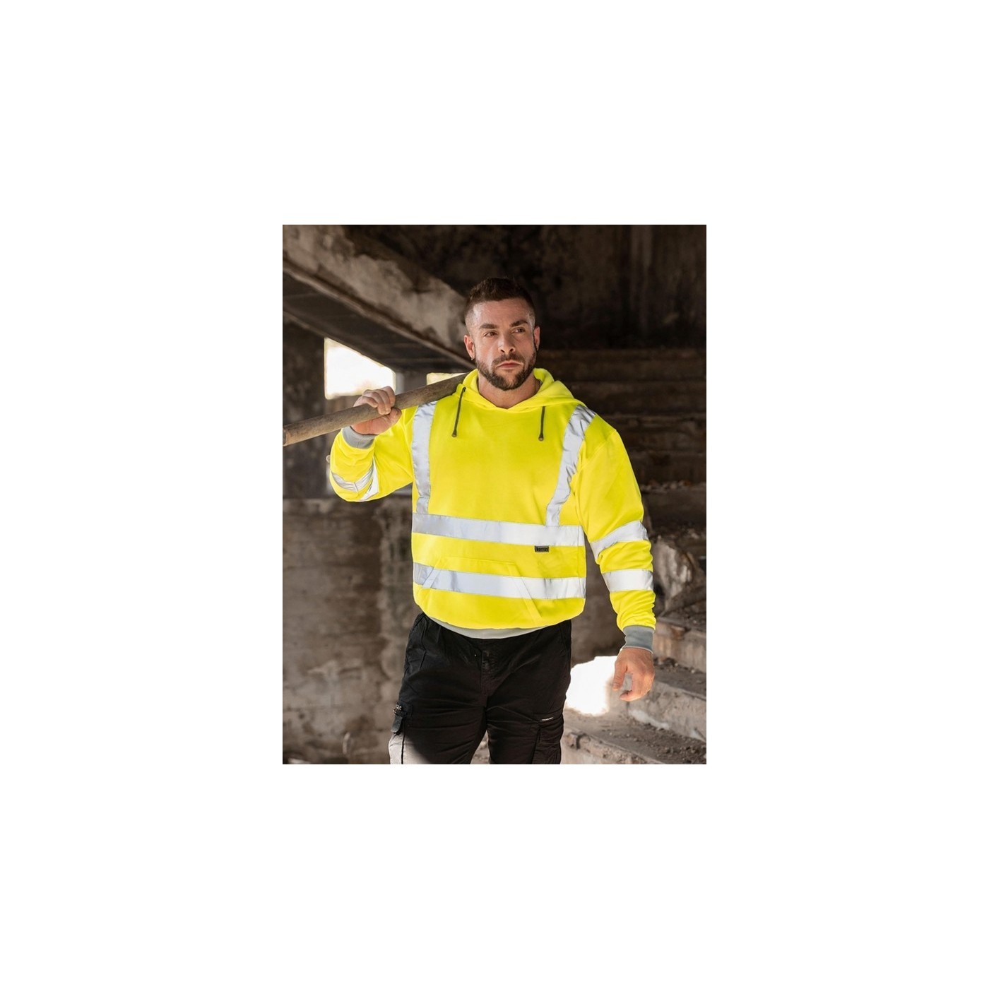 Descubre nuestra exclusiva sudadera con capucha de alta visibilidad, confeccionadas con un 100% de poliéster para ofrecerte la máxima durabilidad y comodidad. Estas sudaderas cuentan con una moderna capucha equipada con cordones grises, un práctico bolsillo canguro y detalles distintivos como puños y bajo de canalé gris en contraste.