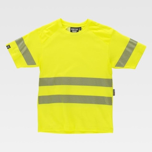 Camiseta de manga corta en micropiqué con interior de algodón, ligera y transpirable. Incorpora bandas reflectantes segmentadas y tejido de rejilla en axilas para mayor ventilación. Cumple normativa EN ISO 20471 nivel 2.