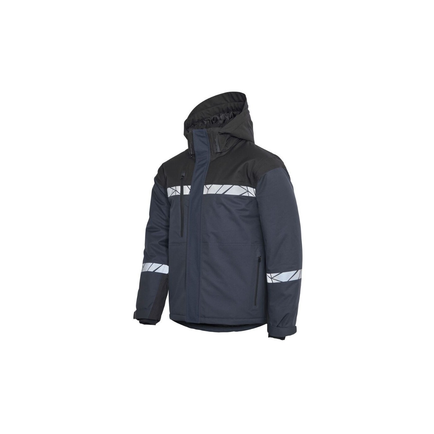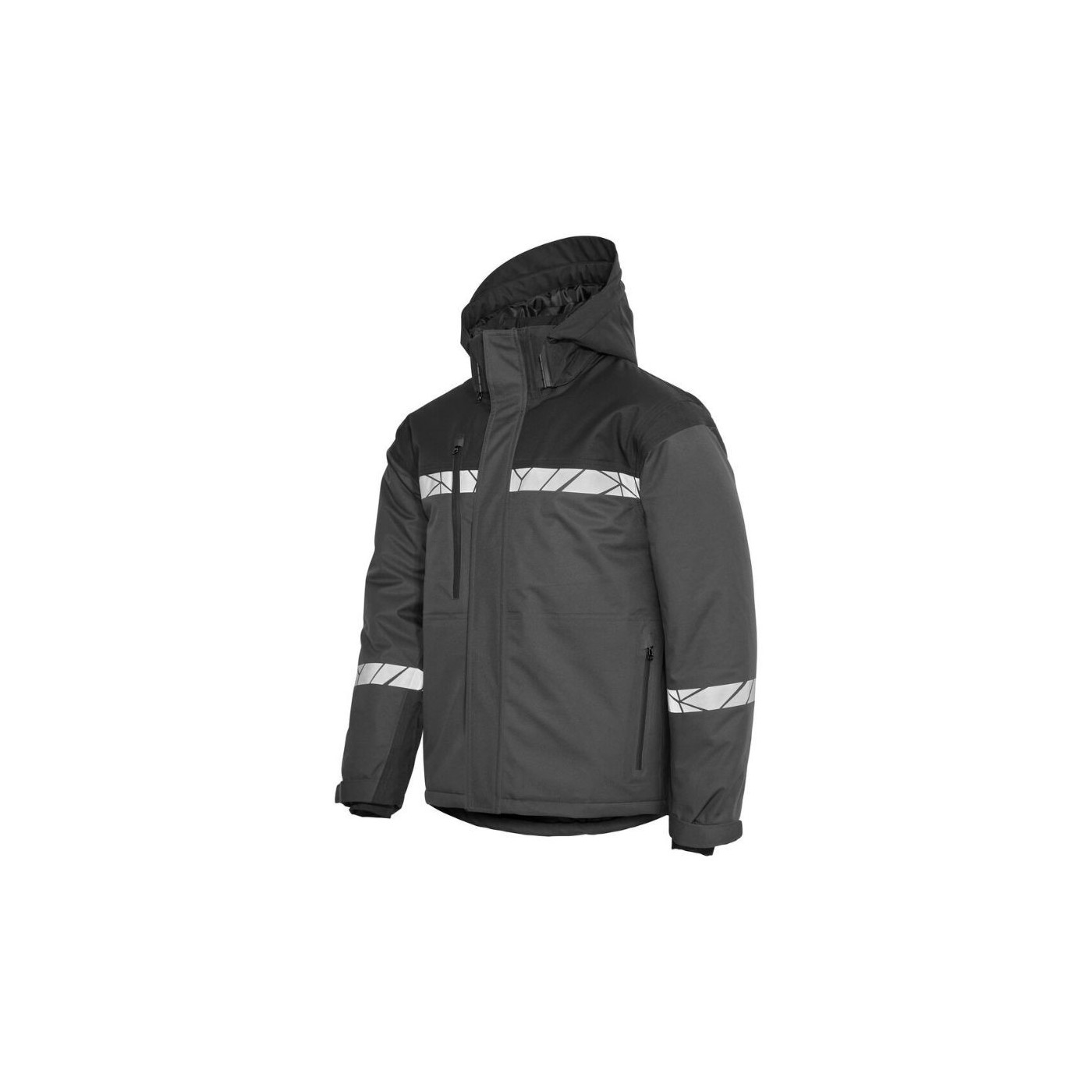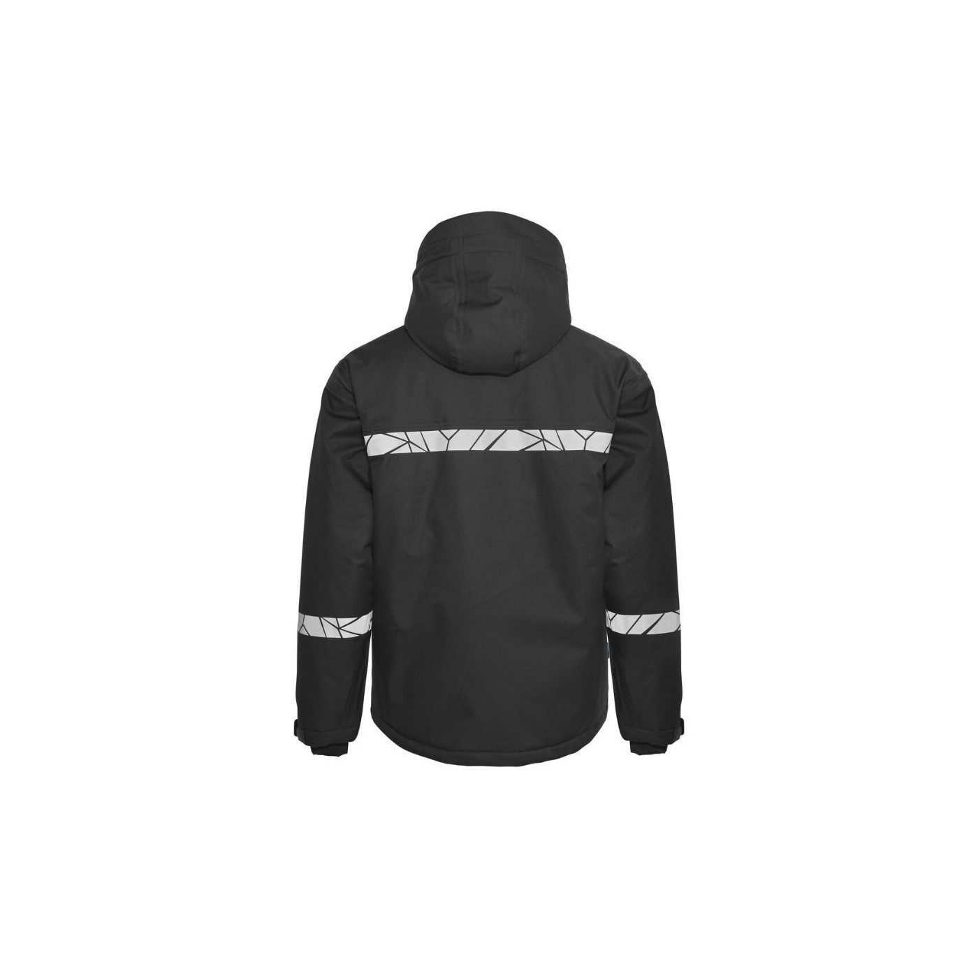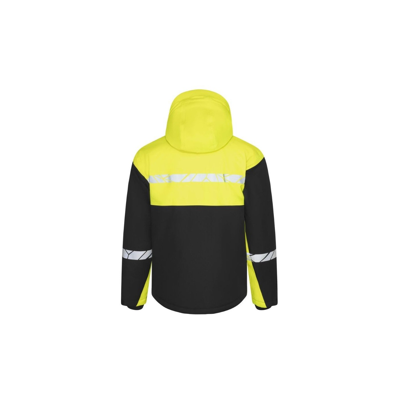 Chaqueta softshell acolchada resistente al viento y al agua, con capucha desmontable, bolsillos multifuncionales y mayor visibilidad EN 17353. Fabricada con materiales reciclados y apta para lavado industrial.