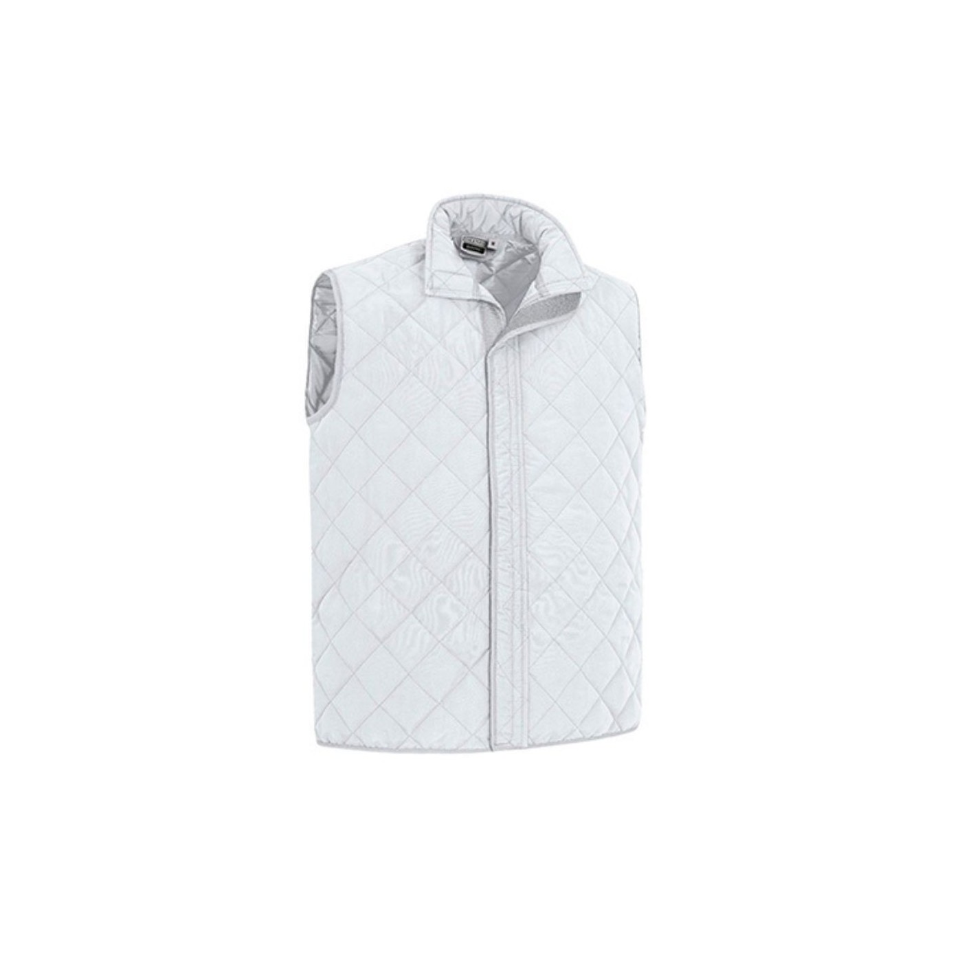 Chaleco acolchado sin bolsillos ni cremalleras, diseñado para la industria alimentaria. Ligero, térmico y seguro, con cierre de velcro frontal.