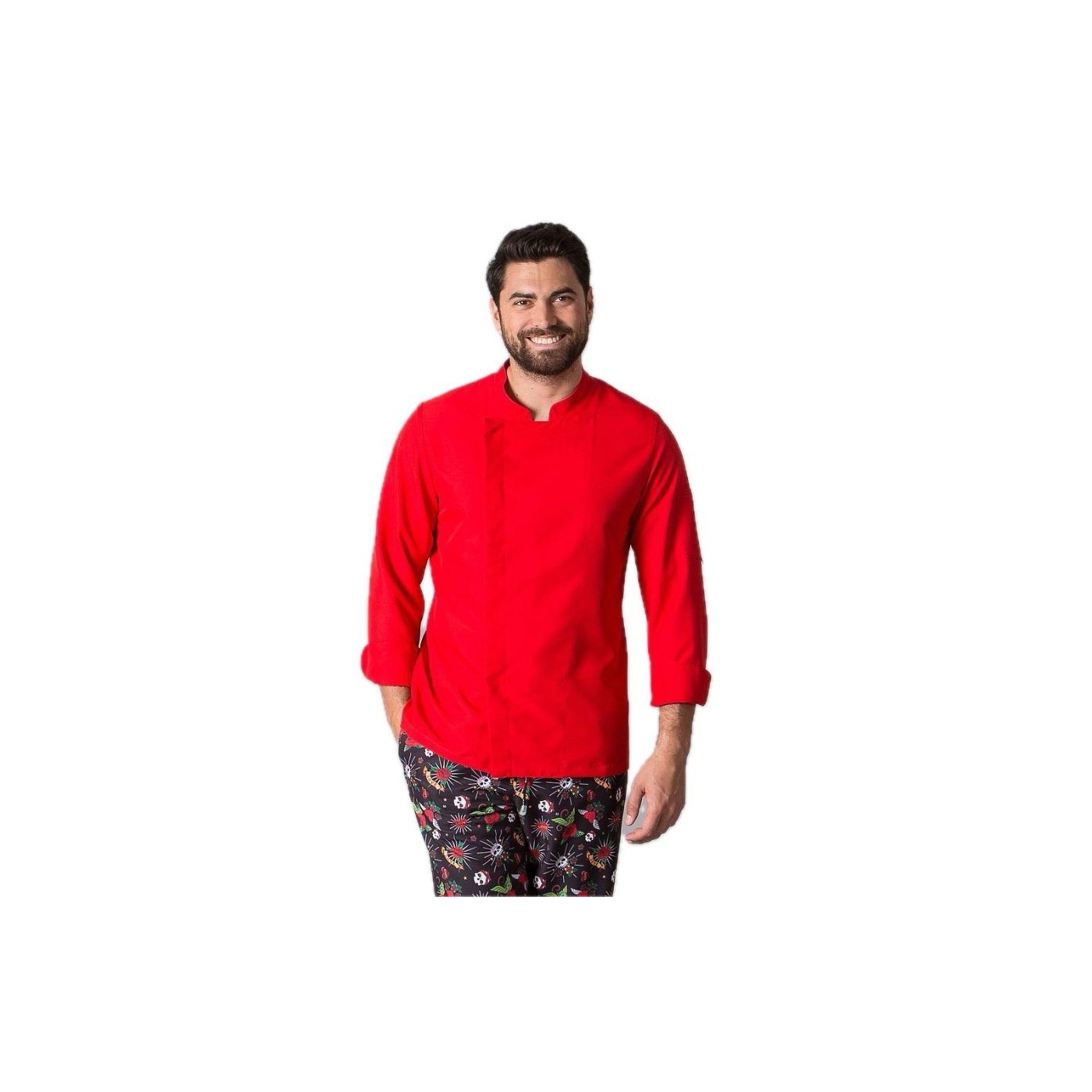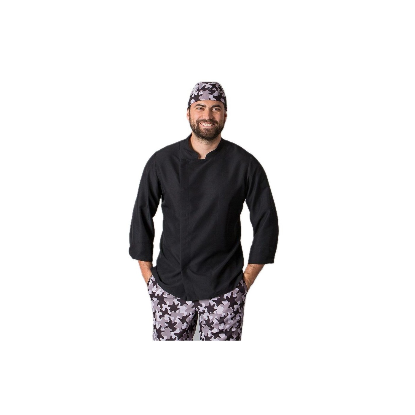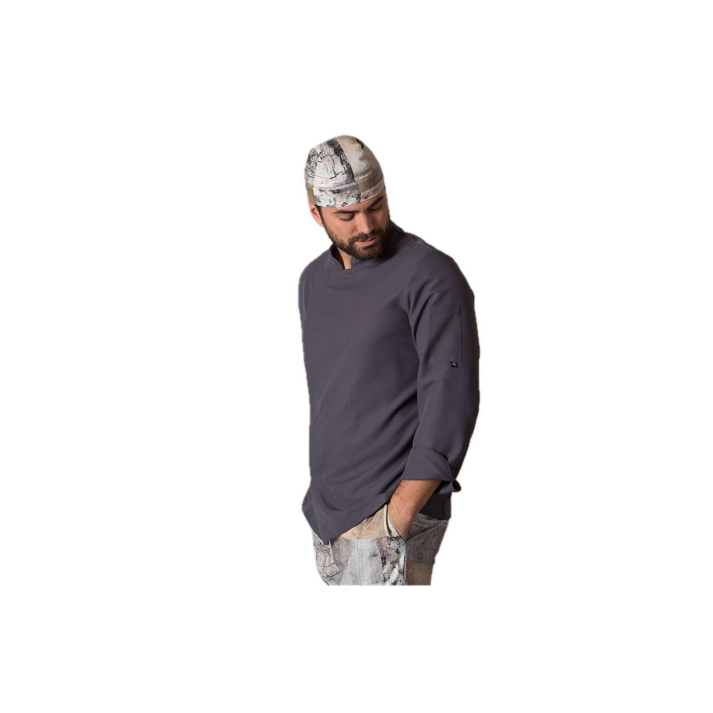 Chaqueta para cocinero de manga larga con estilo mao, puños doblados, un bolsillo en la manga izquierda y cierre de botones de presión invisibles en diseño cruzado.