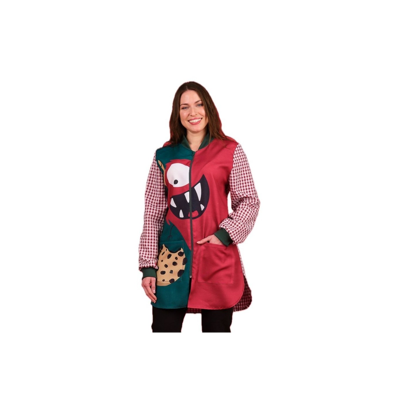 Bata maestra divertida y original con estampado de monstruo y galleta. ¡Ideal para profes creativas! Cómoda y práctica, perfecta para el día a día en el aula.
