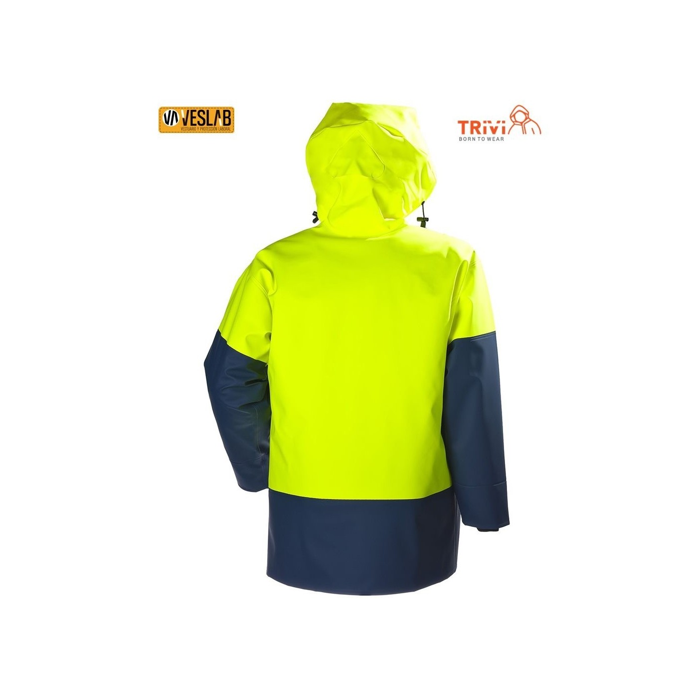 Chaqueta bicolor de pesca en alta mar cerrada con cierre frontal en tercio superior mediante fuelle interior y solapa que cierra a su vez con cinta de contacto.