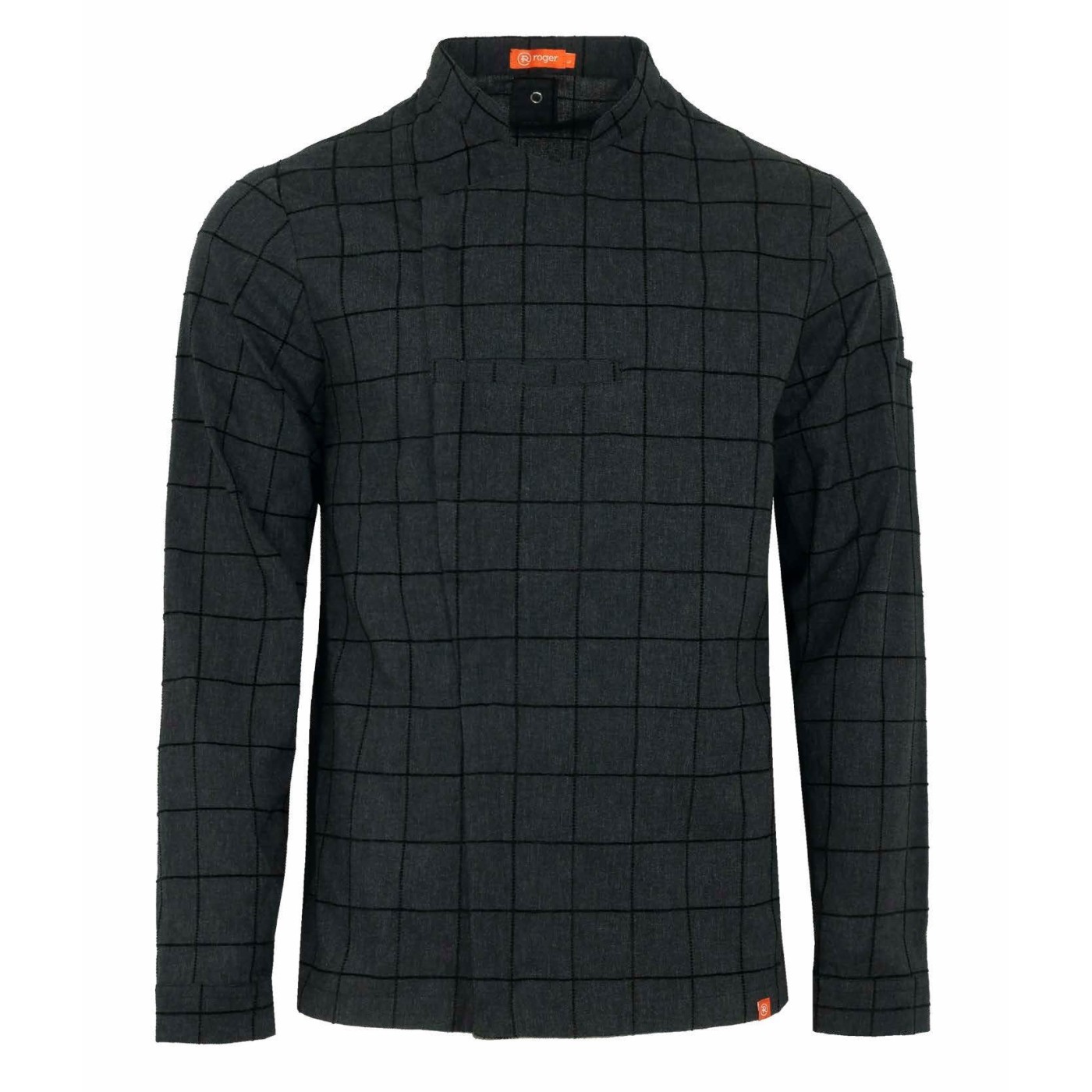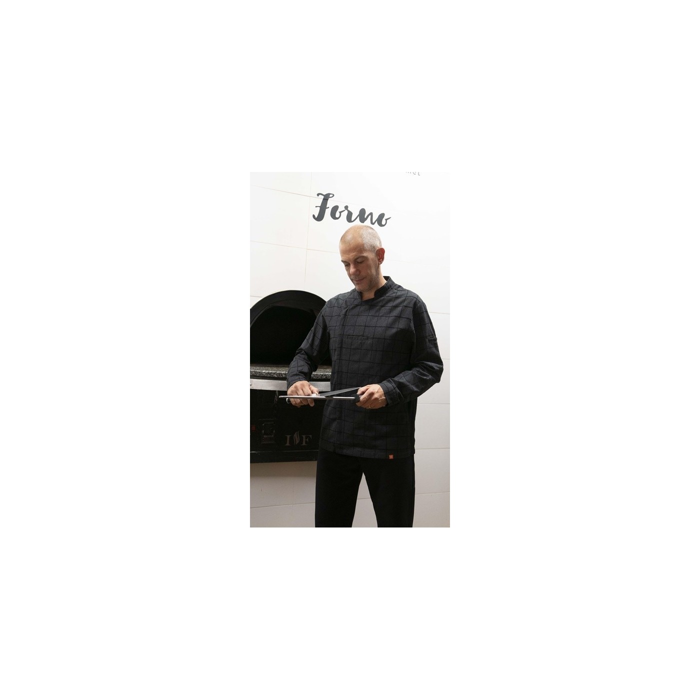 Chaqueta de cocina muy elegante de diseño cruzado y con cremallera antipánico, cuello mao y COOLMAX en la espalda para facilitar la movilidad y transpirabilidad.