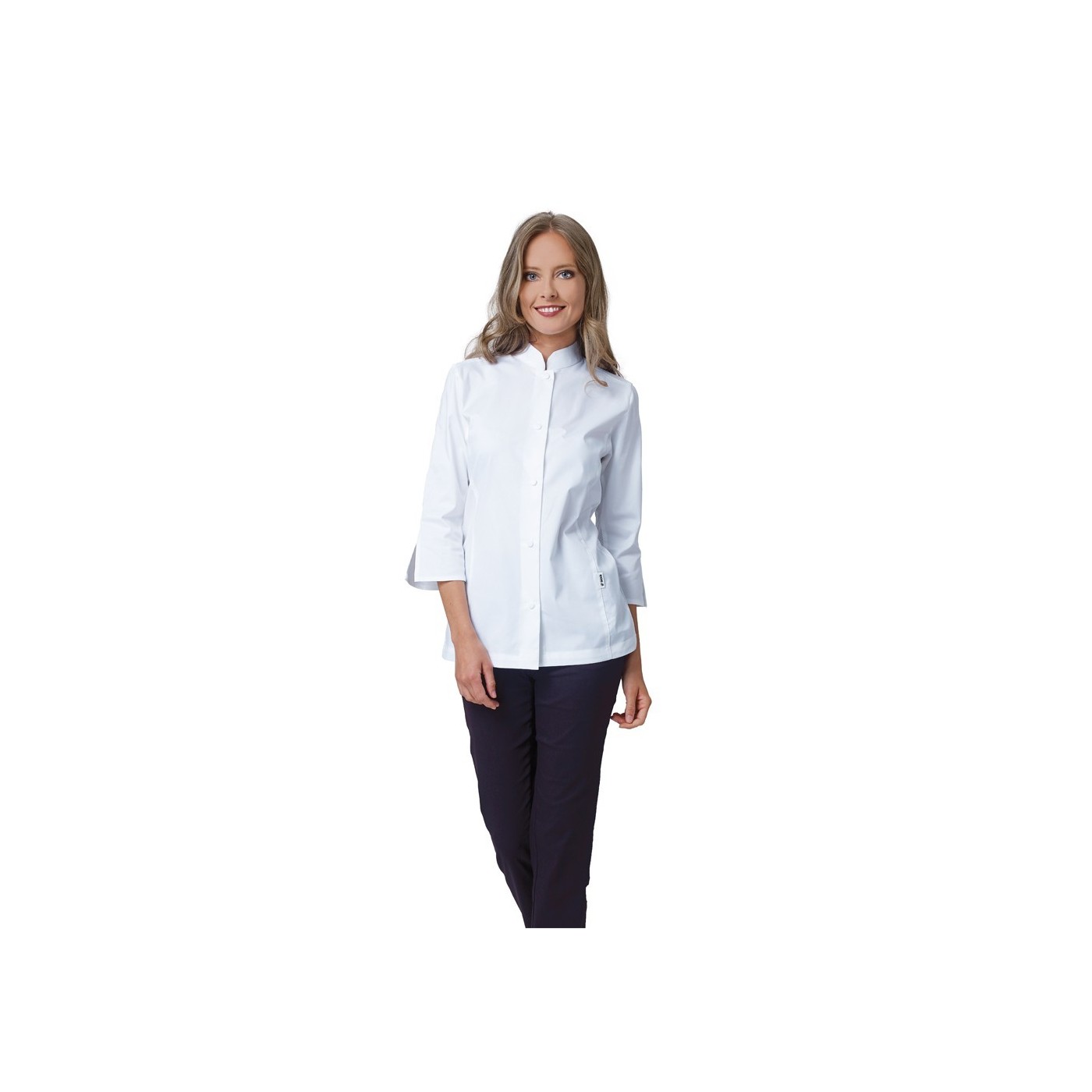 Descubre nuestra elegante chaqueta de cocina para mujer Mina de la reconocida marca italiana Siggi, una prenda diseñada con atención a los detalles y con diversas características que la distinguen.