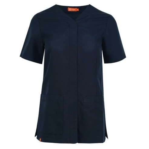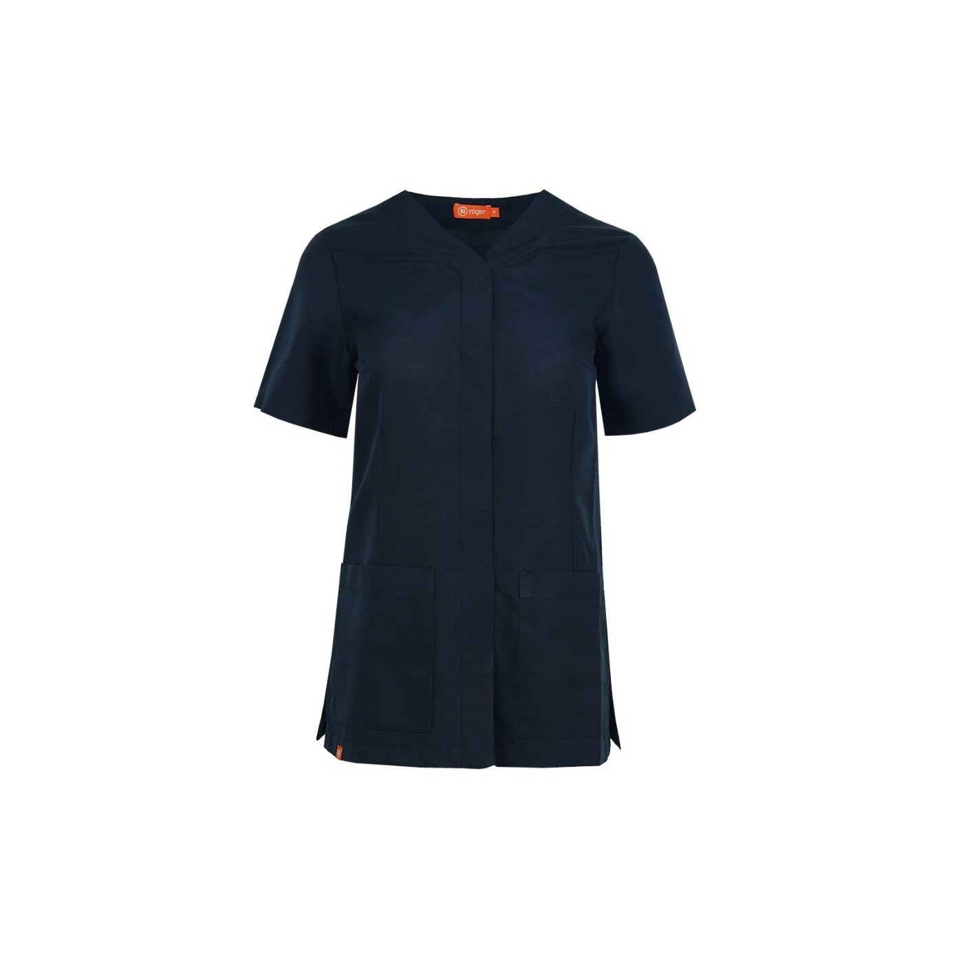 Casaca de sanitario de mujer con botonadura central oculta con botones clip de presión. Lleva dos bolsillos delanteros y costadillos. Con aperturas laterales.