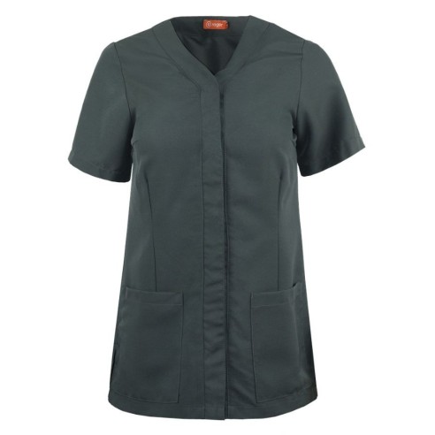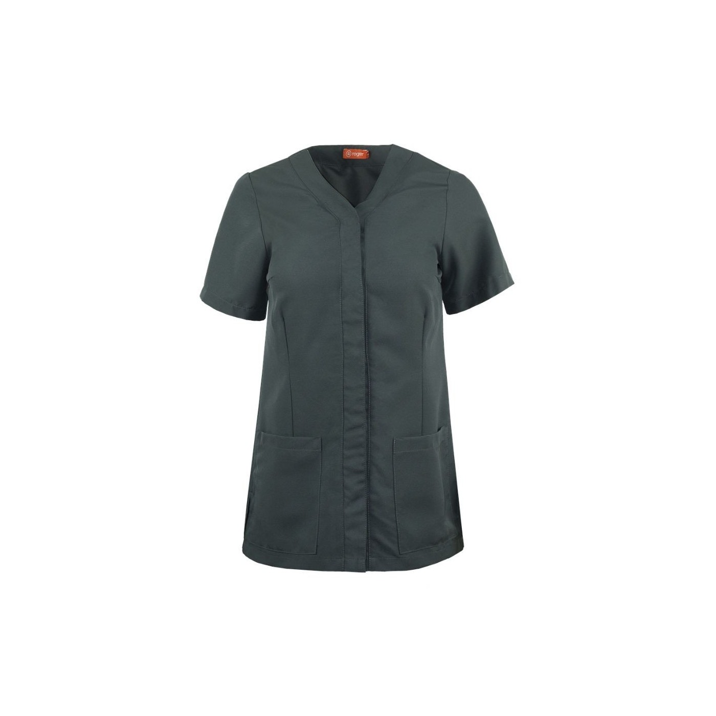 Casaca de sanitario de mujer con botonadura central oculta con botones clip de presión. Lleva dos bolsillos delanteros y costadillos. Con aperturas laterales.