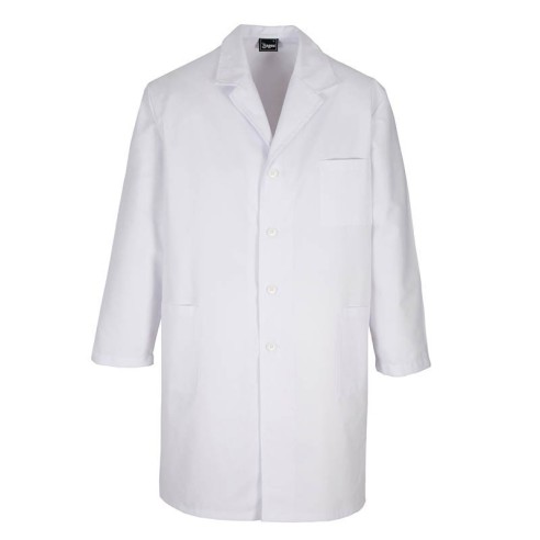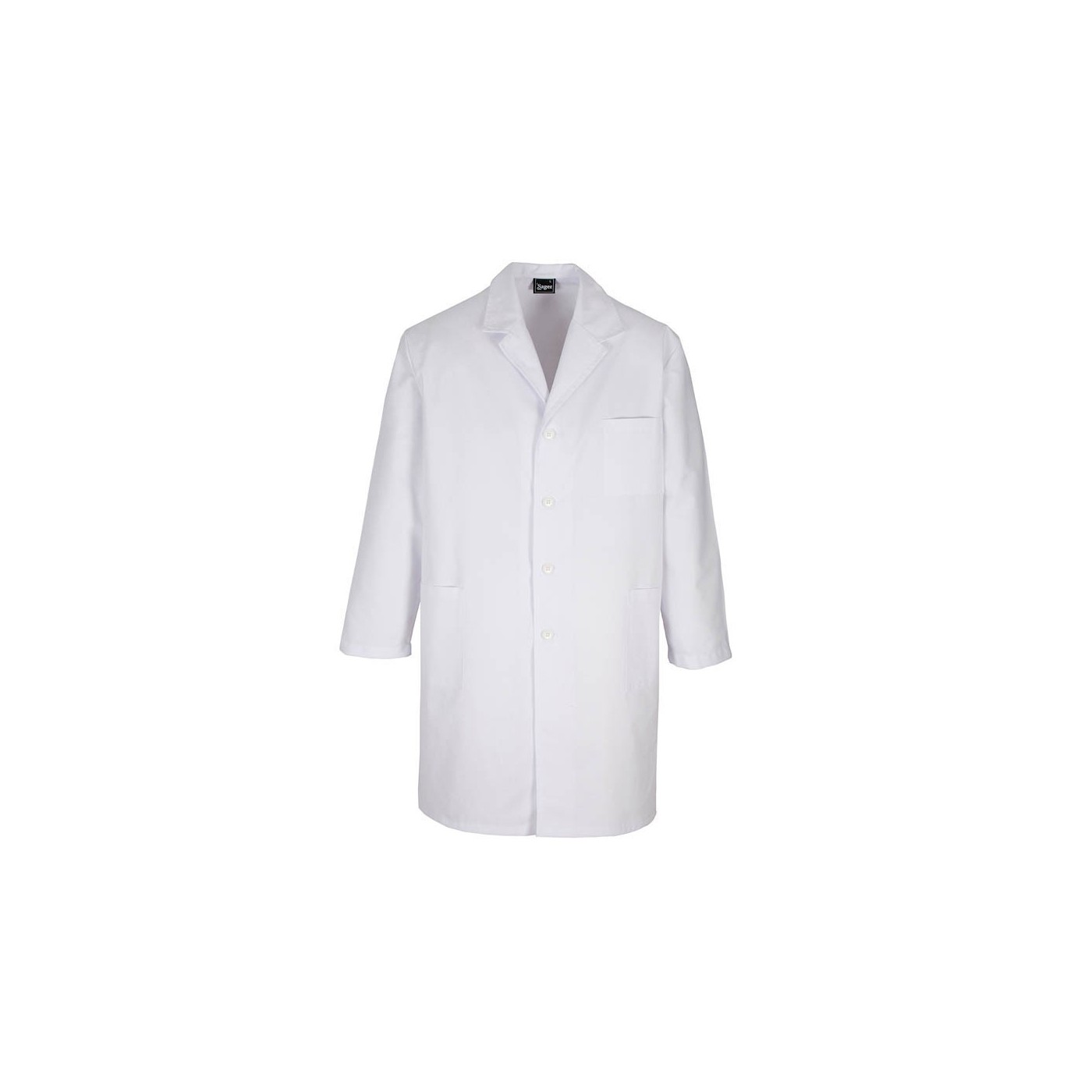 Bata blanca al mejor precio básica de tallaje unisex y manga larga. Dispone de tres bolsillos, cuello en solapa y cinturón trasero.