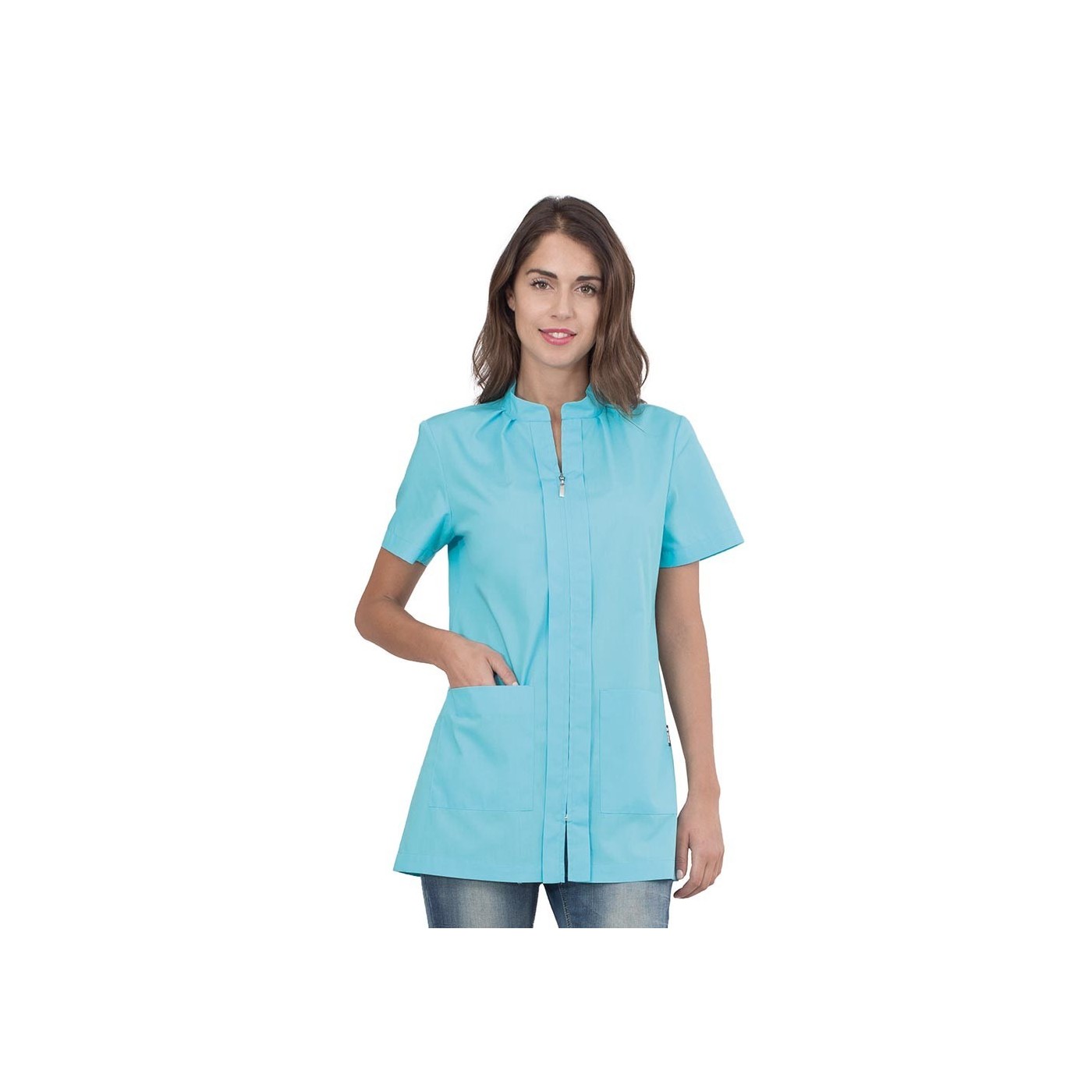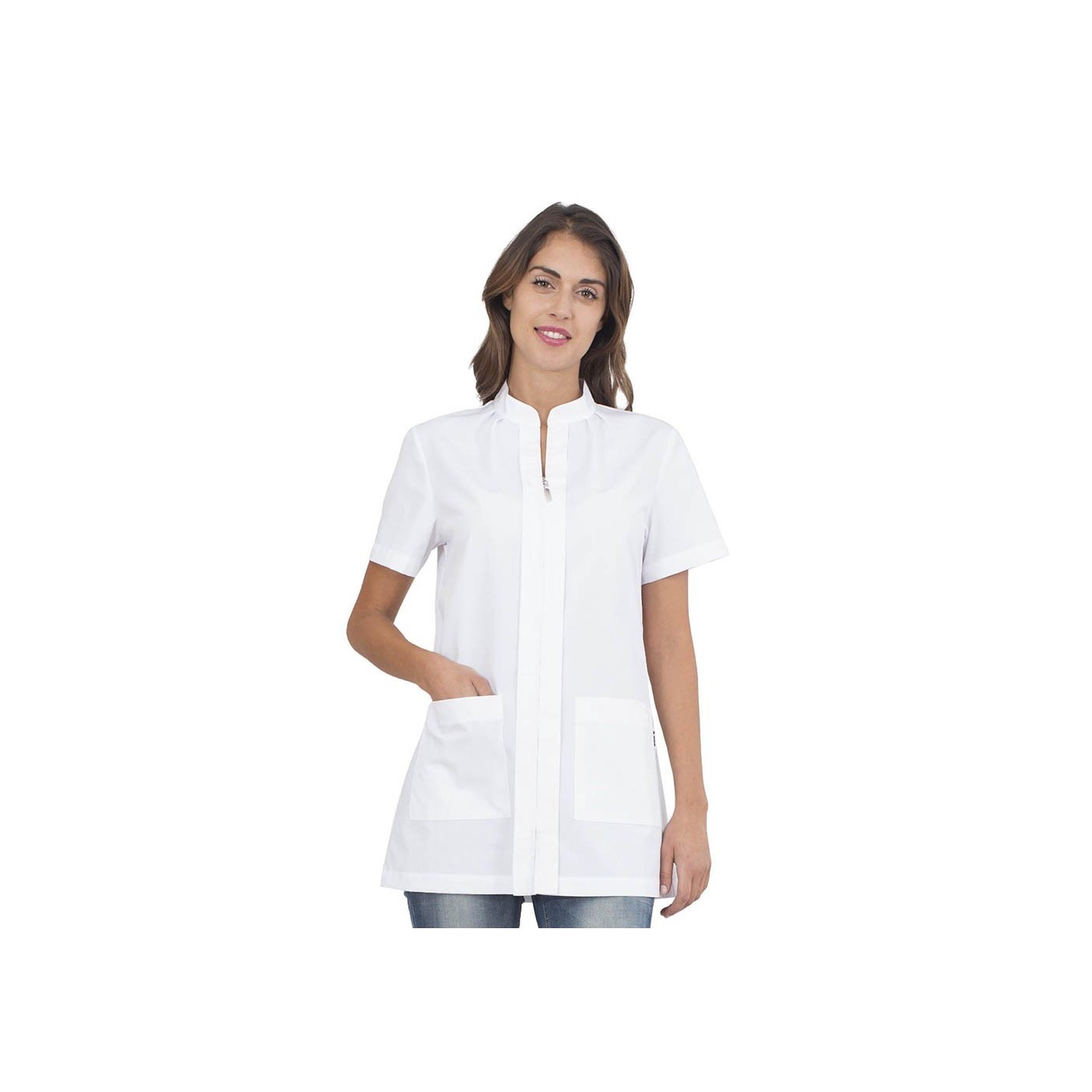 La casaca de trabajo Alix de Siggi destaca por su diseño moderno y funcional. Su apertura con una cremallera oculta en la parte frontal permite un fácil acceso y un ajuste personalizado. Esta característica es especialmente conveniente para aquellos que necesitan ponerse o quitarse la casaca rápidamente durante su jornada laboral.