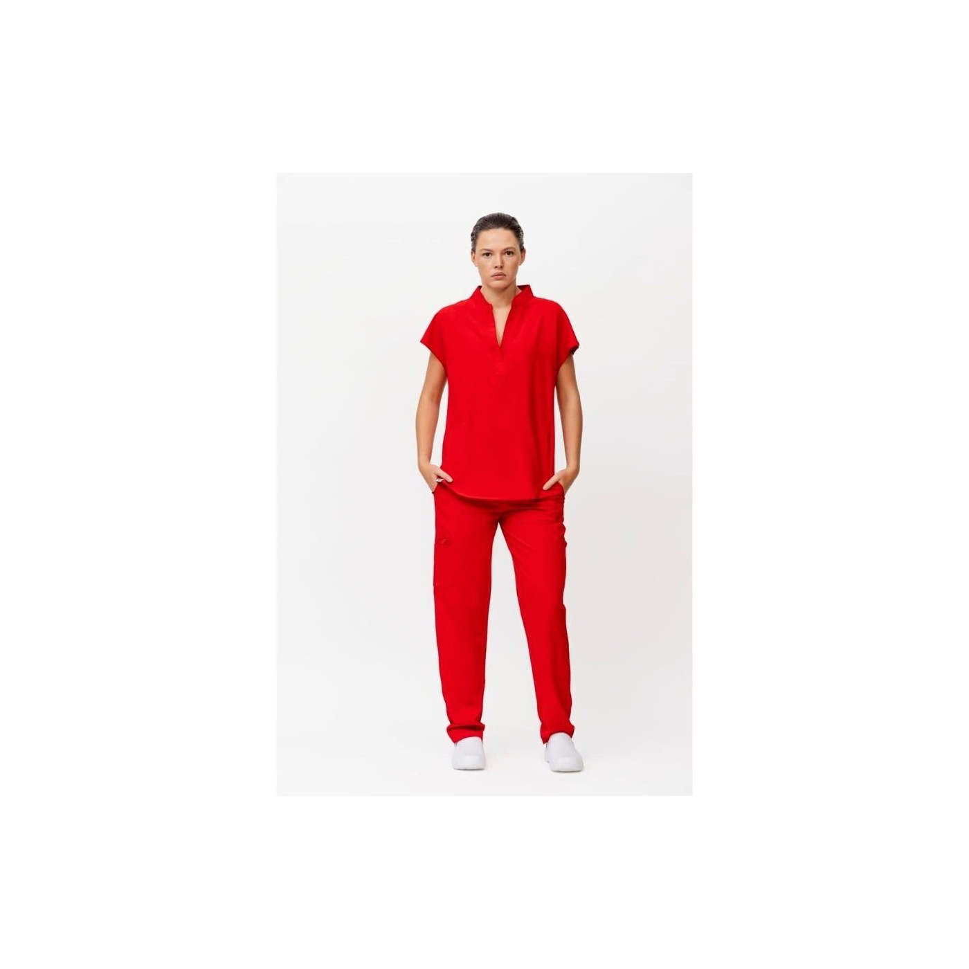 El pantalón unisex con tejido elástico ofrece comodidad y libertad de movimiento, con bolsillos laterales y en perneras, y cintura ajustable con cordón. Ideal para profesionales de la salud.