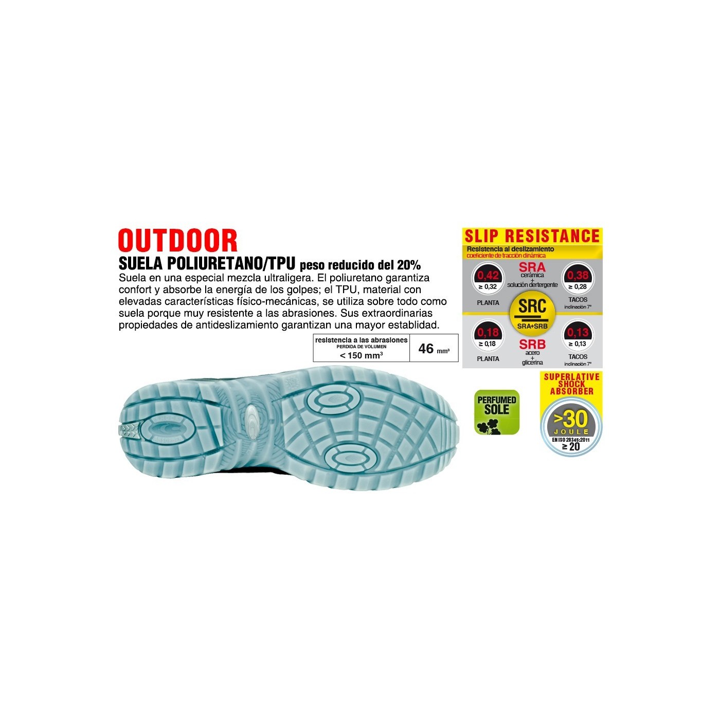 PLANTILLA: EVANIT con especial mezcla de EVA y nitrilo, de gran confort y espesor variable. Termoformada, perforada y forrada con tejido muy transpirable
