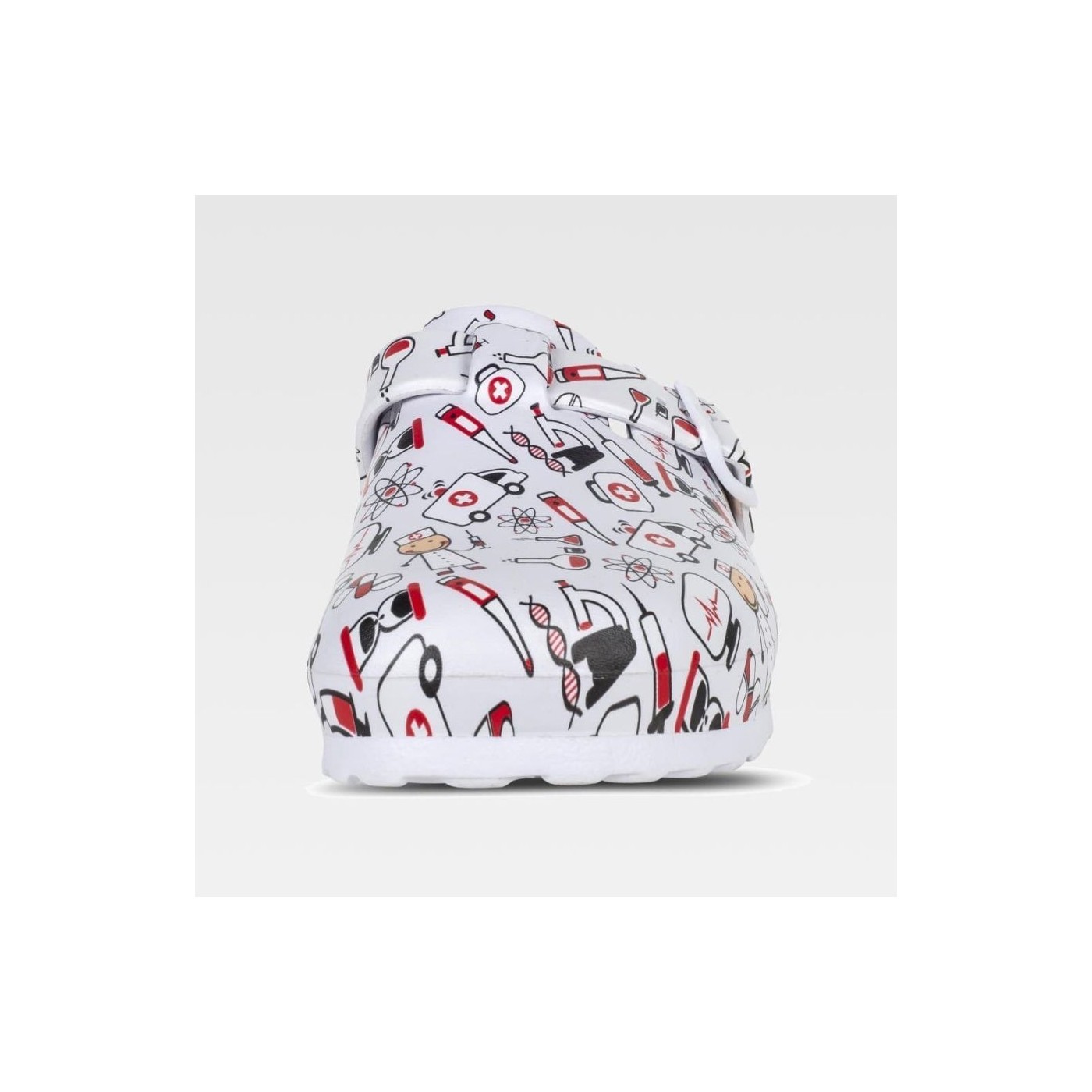 El zueco estampado sanitario es ultraligero, fabricado en EVA, con diseño ergonómico y anatómico, hebilla ajustable y cámara ortopédica para máximo confort. Ideal para profesionales de la salud.