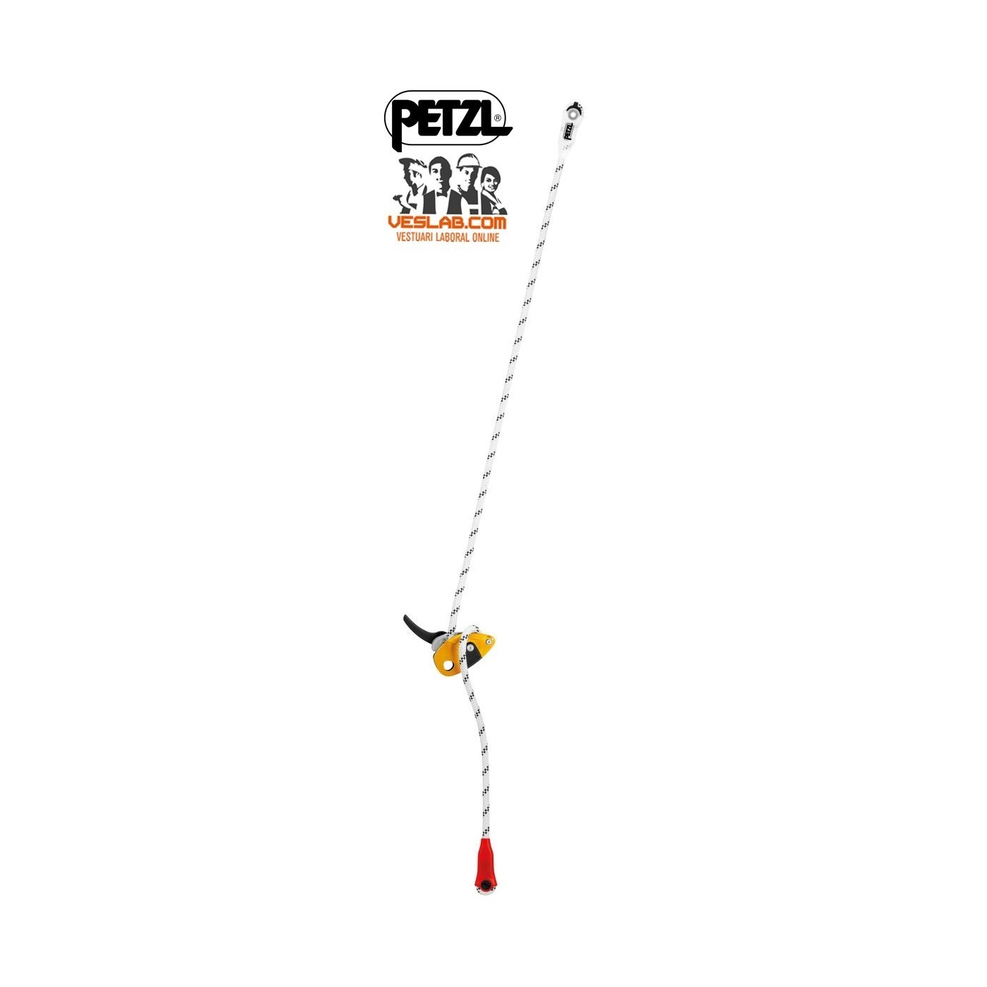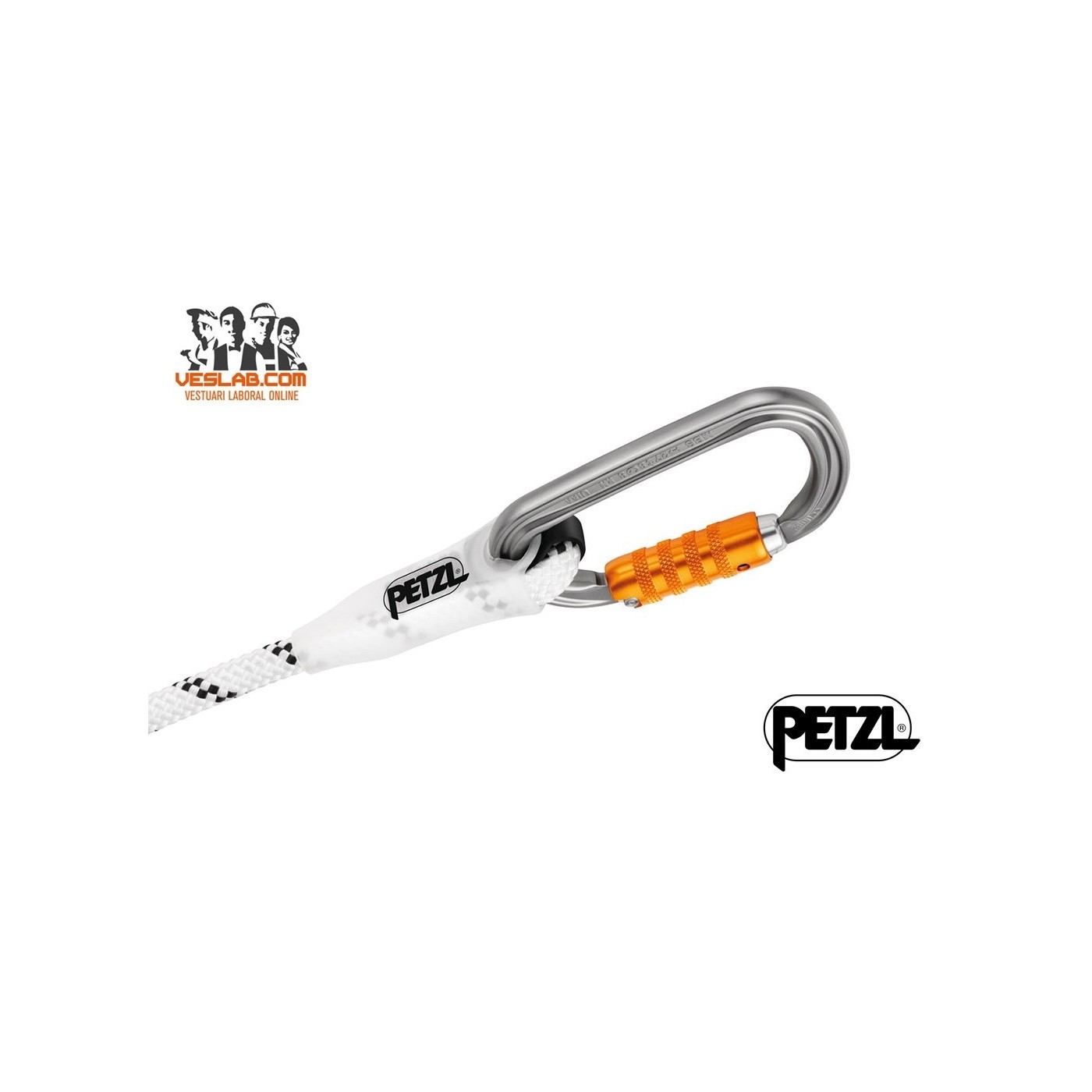 - à simple sur le point d’attache ventral du harnais lorsque l’amarrage est situé au-dessus de l’utilisateur, de manière à répartir la charge entre la ceinture et les cuisses pour plus de confort. Le réglage est réalisé en actionnant la poignée, tout en maintenant le brin libre de la longe. - Terminaisons cousues aux deux extrémités avec gaine plastique pour maintenir le connecteur en position et protéger la corde de l’abrasion.