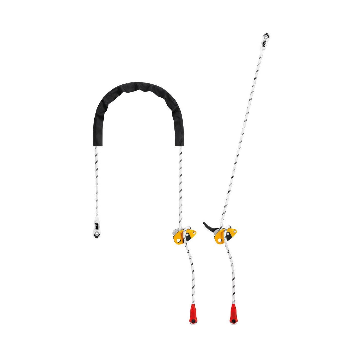 - Gaine de protection permettant de protéger la corde des points de contact agressifs, tout en favorisant le coulissement de celle-ci. Cette protection est amovible, ce qui permet de remonter au plus près de l’ancrage lorsque la longe est utilisée à simple.