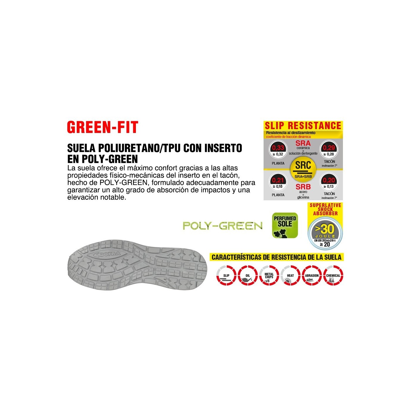 SEMELLE DE PROPRETE: ECO-TECH in POLY-GREEN, anatomique, antistatique, perforée, parfumée, souple et confortable. La couche supérieure en tissu antibactérien absorbe la sueur et garde le pied toujours au sec