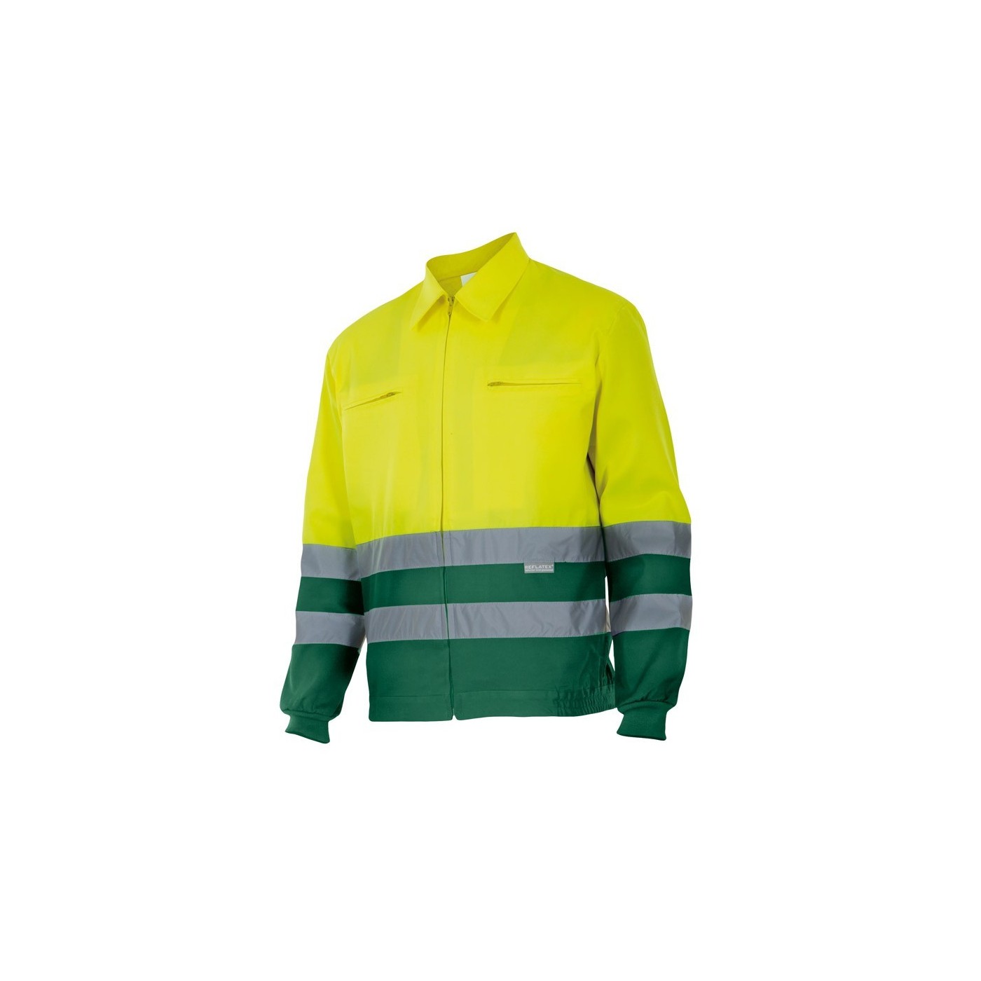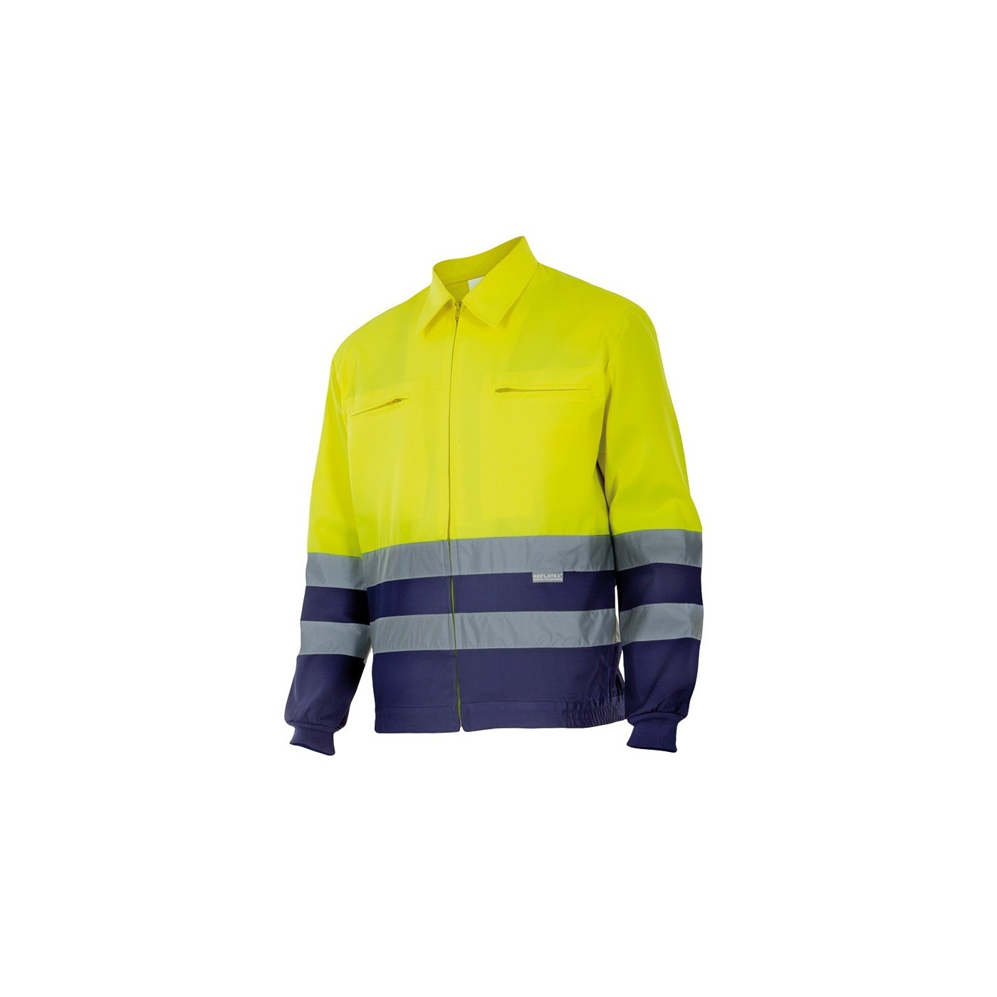 Veste en deux couleurs à haute visibilité avec des bandes réfléchissantes sur le torse et les manches. Fermeture centrale, poignets côtelés et deux poches zippées.