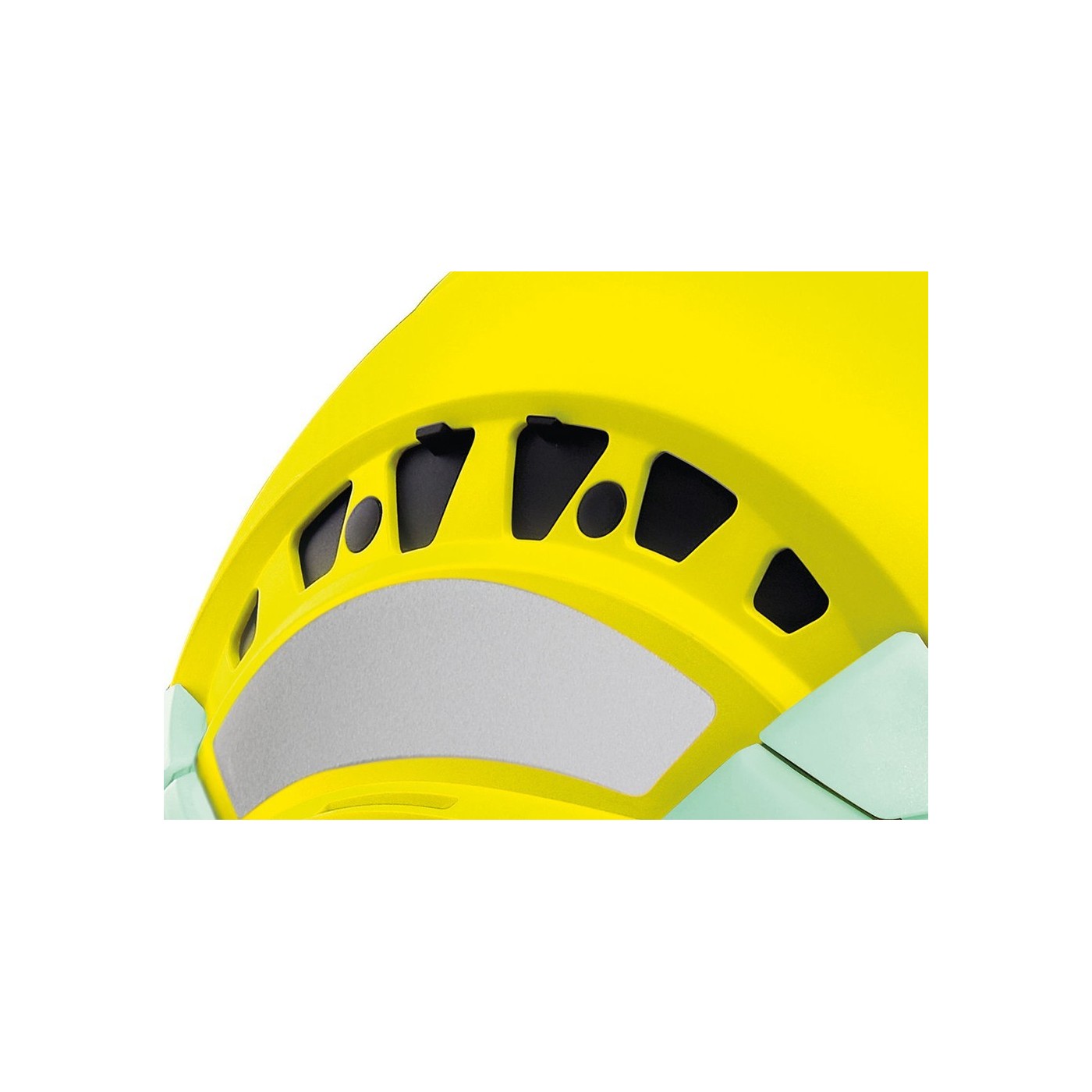 Casque confortable et ventilé d'haute visibilité. La version haute visibilité est dotée d'une coque externe de couleur fluorescente avec des clips phosphorescents et des bandes réfléchissantes, pour une visibilité optimale du travailleur, de jour et de nuit.