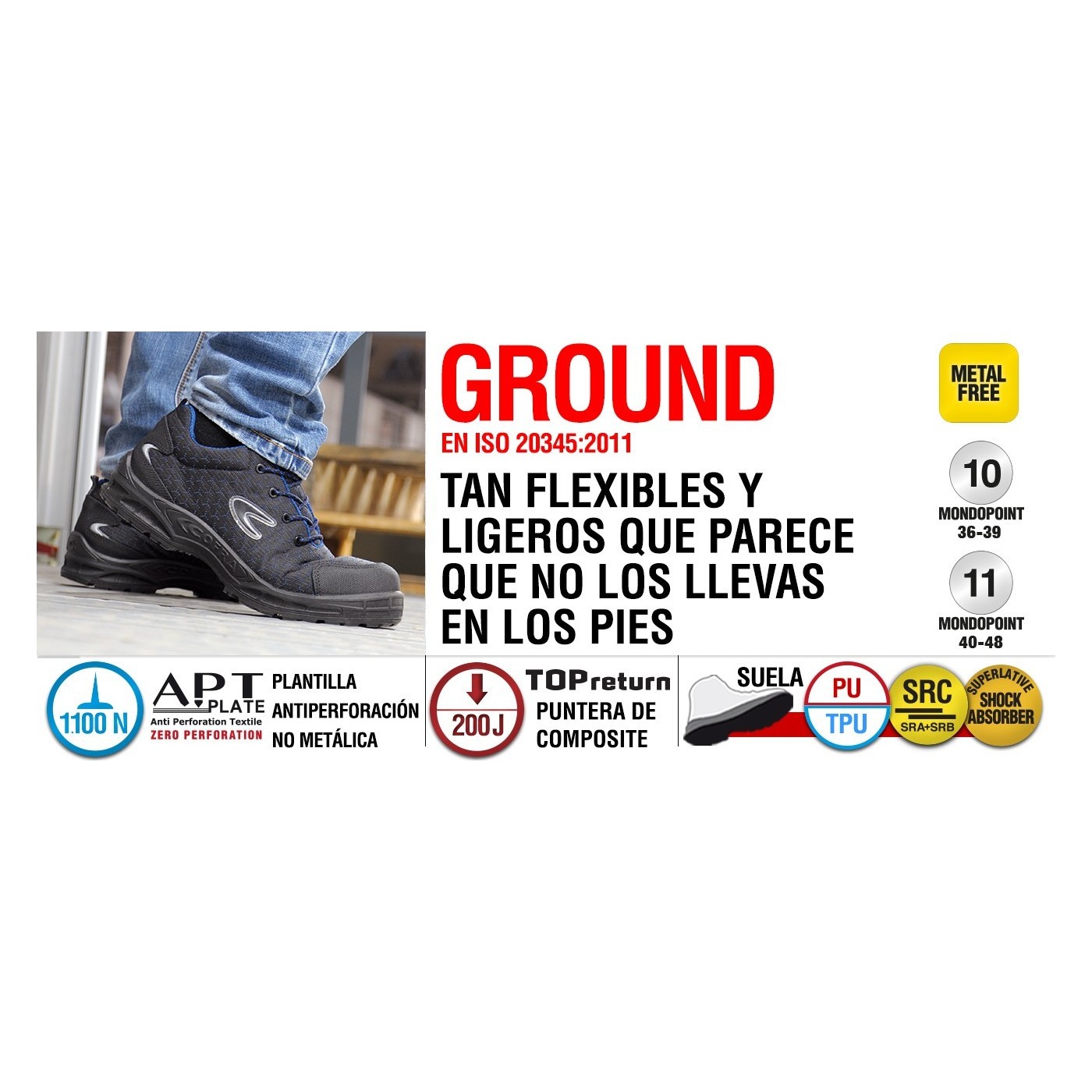 GABARIT: EVANIT avec mélange spécial d'EVA et de nitrile, de grand confort et d'épaisseur variable (12 mm - 8 mm - 3,8 mm). Thermoformé, anatomique, perforé et doublé de tissu très respirant. Antistatique grâce à un traitement de surface spécial et des coutures en fils conducteurs