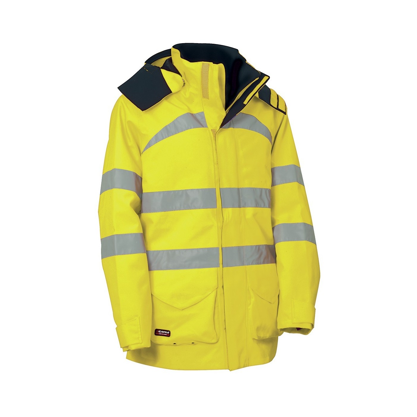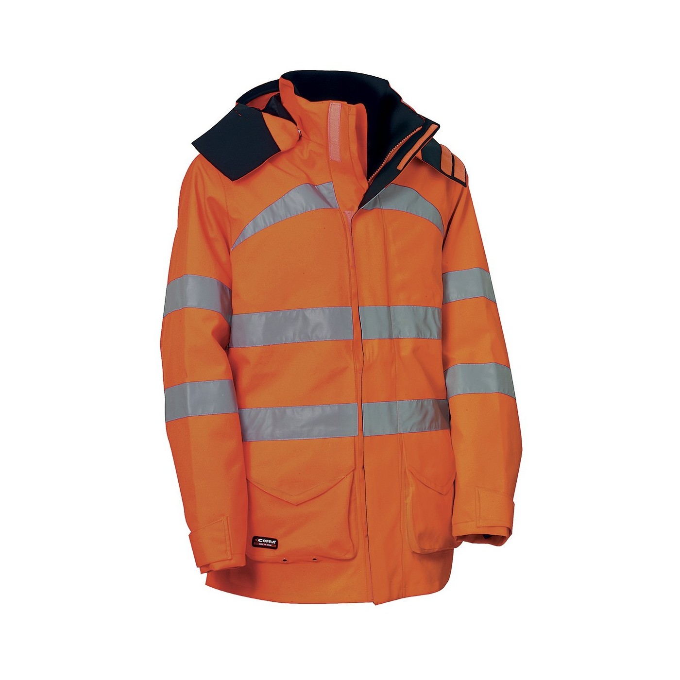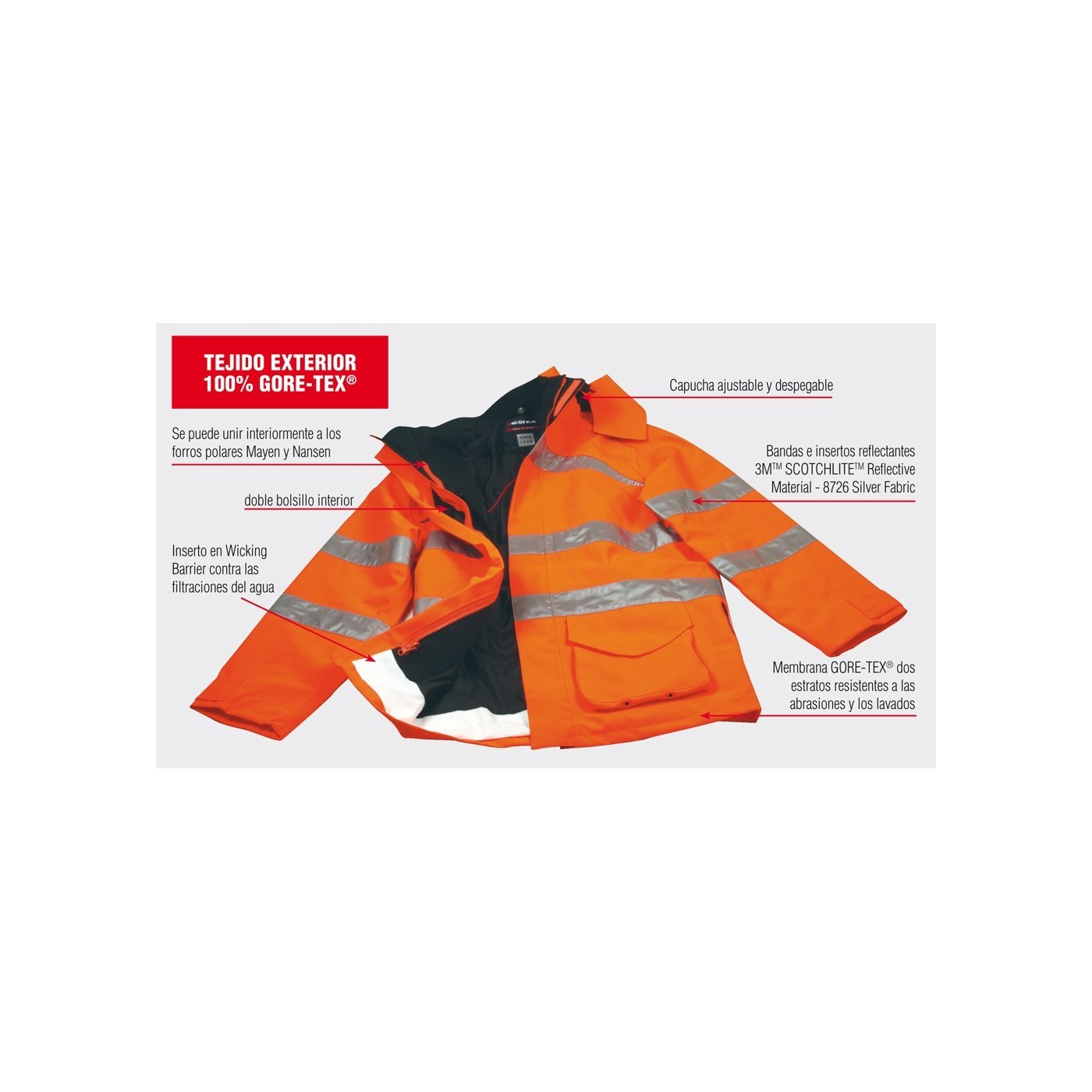 DESCRIPTION: 2 poches larges à l’avant, 2 poches intérieures 1 poche avec zip , 2 poches napoléon, bande ed inserts réfléchissantes 3M™ Scotchlite™ Reflective Material - 8726 Silver Fabric , capuche ajustable et détachable , poignets ajustables, entièrement réalisée en tissu GORE-TEX® 2 couches , coutures soudées ou étanchées thermocollée avec bande en GORE-TEX® , zip YKK®
