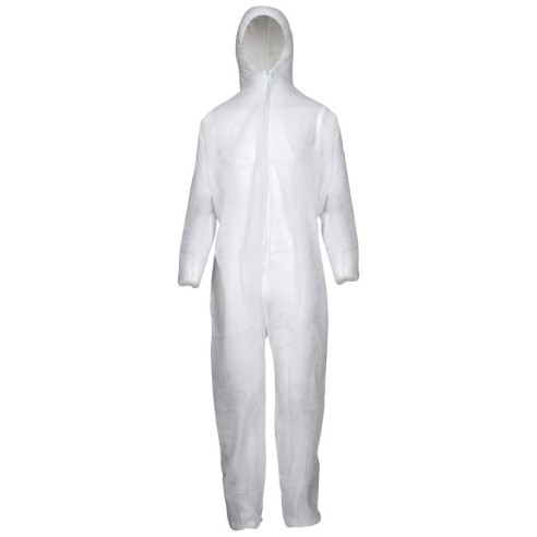 Combinaison jetable intégrale avec capuche et composition légère et hautement respirante.