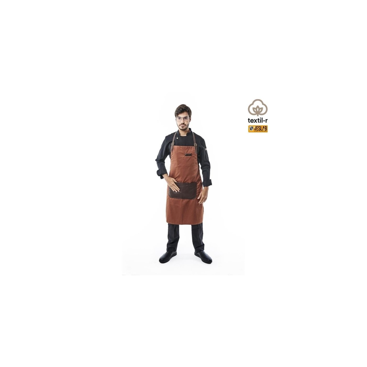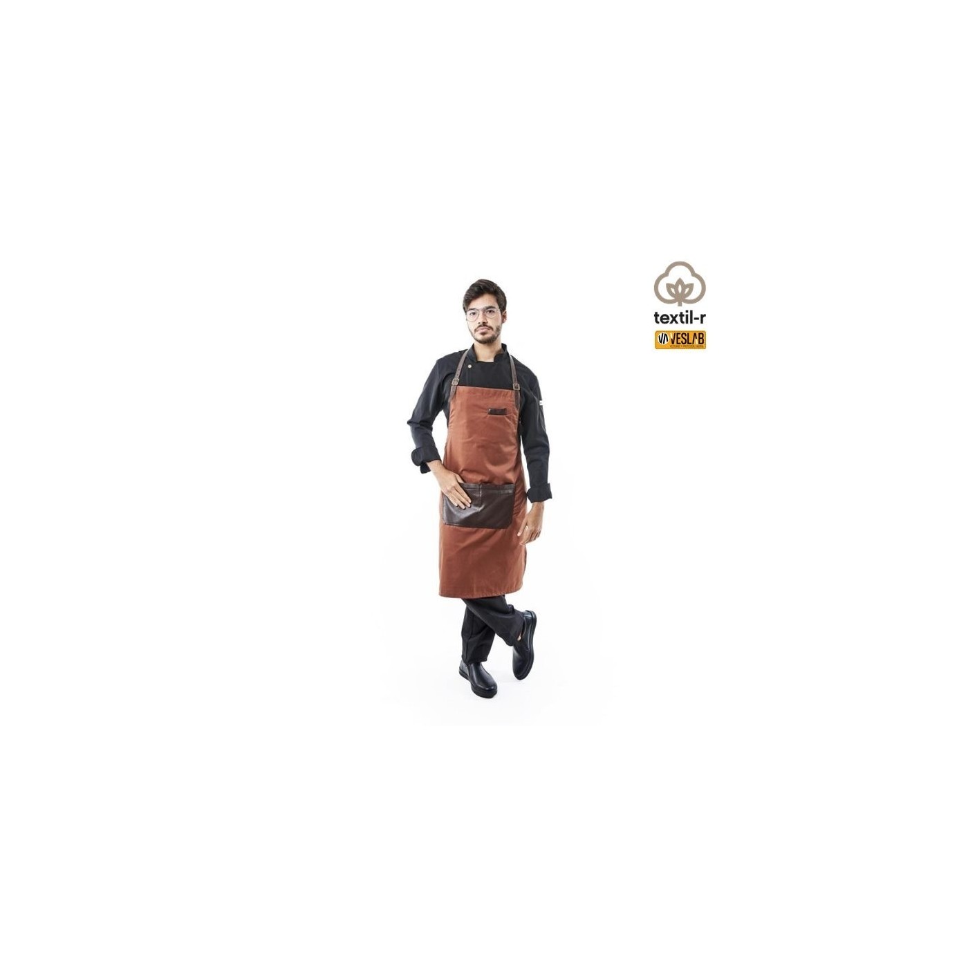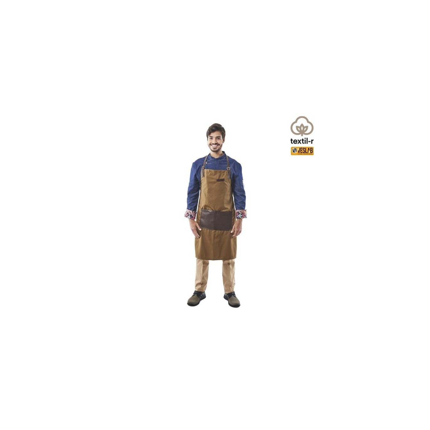 Tablier à bavette combiné avec du simili cuir modèle aneth avec une poche centrale pratique divisée en deux et des boucles vieil or pour ajuster le cou et lui donner une touche rétro. De plus, il possède une poche poitrine pour les stylos, les ouvre-boîtes.