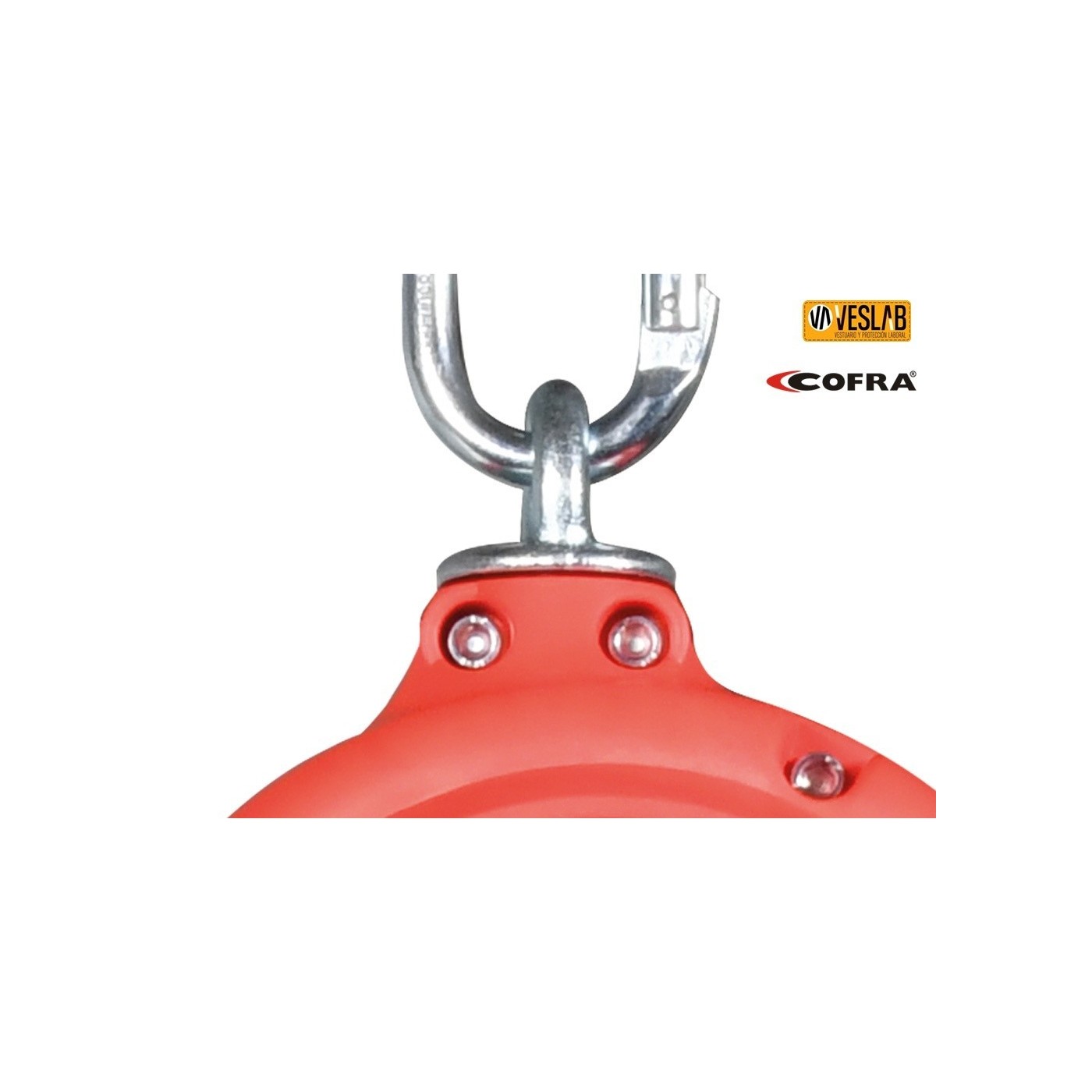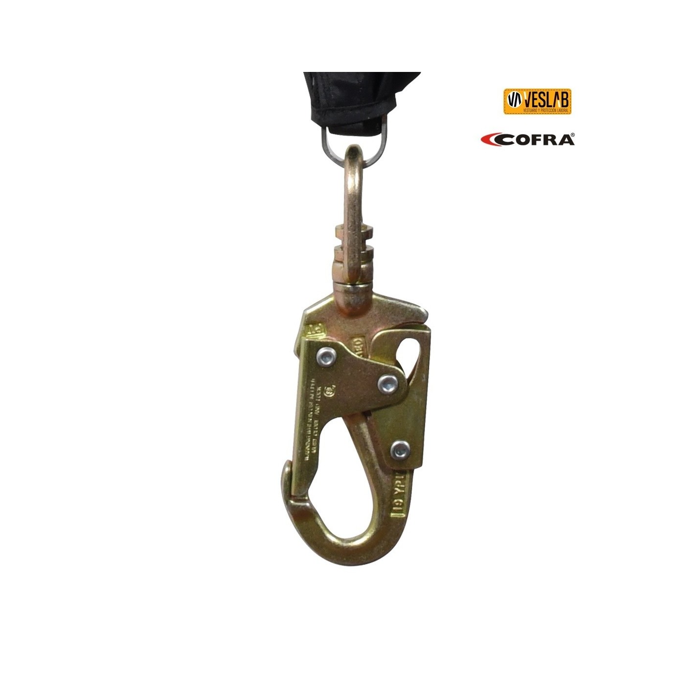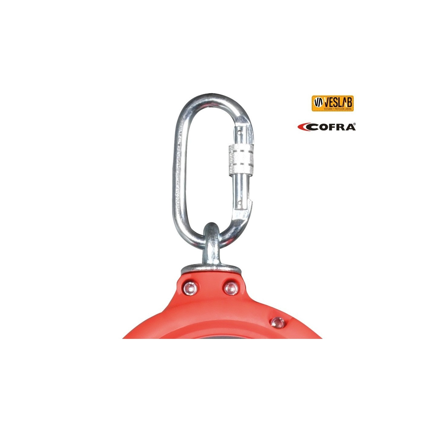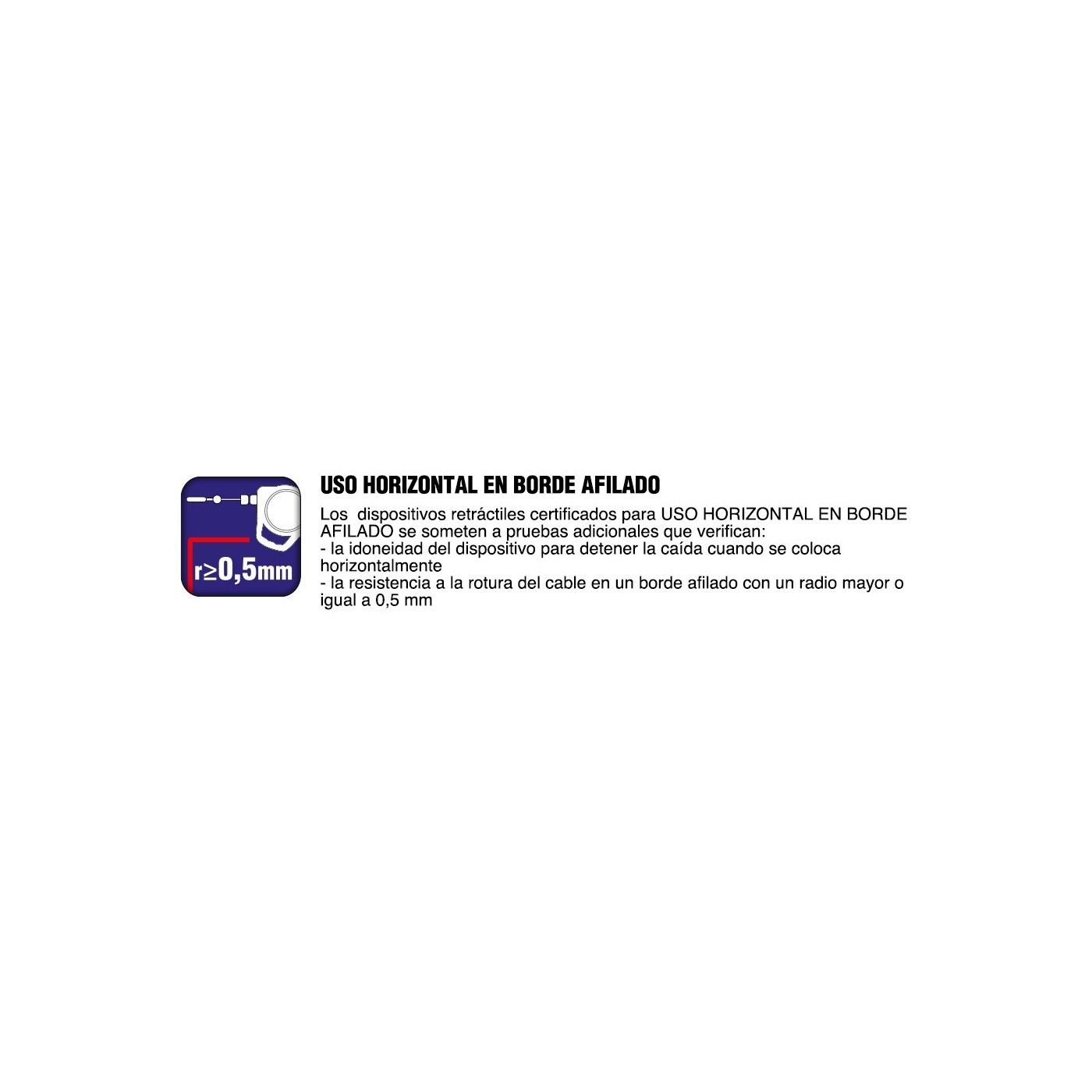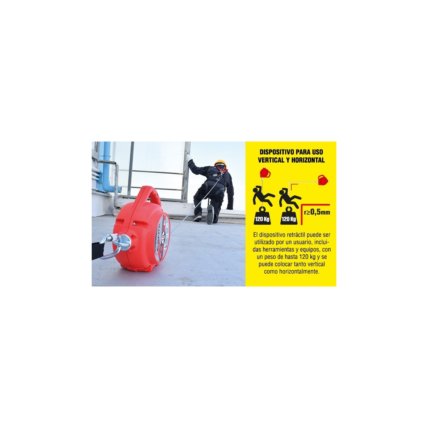 Dispositif de type rétractable avec système de freinage intégré et absorbeur d'énergie. Certifié pour une utilisation horizontale sur des arêtes vives d'une masse de 120 Kg. Câble en acier galvanisé. Équipé d'un connecteur de base en acier et de connecteurs de terminaison en acier avec indicateur de chute et SWIVEL.