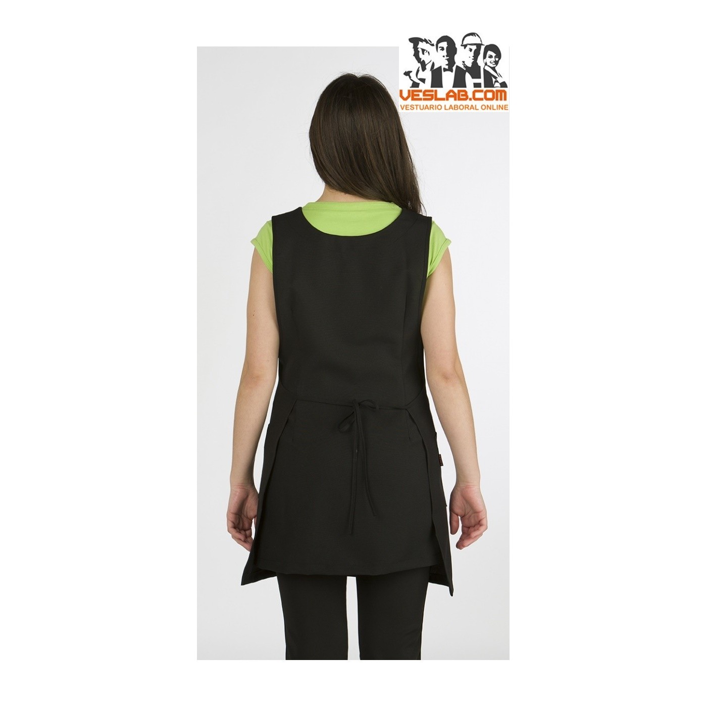 Étole à encolure en V, devant avec lisières et poches, pièce centrale avec passants de ceinture colorés avec boutons, dos avec pince à épiler, emmanchures garnies de vif, ajustement de la taille avec des rubans croisés dans le dos et noeud à la taille.