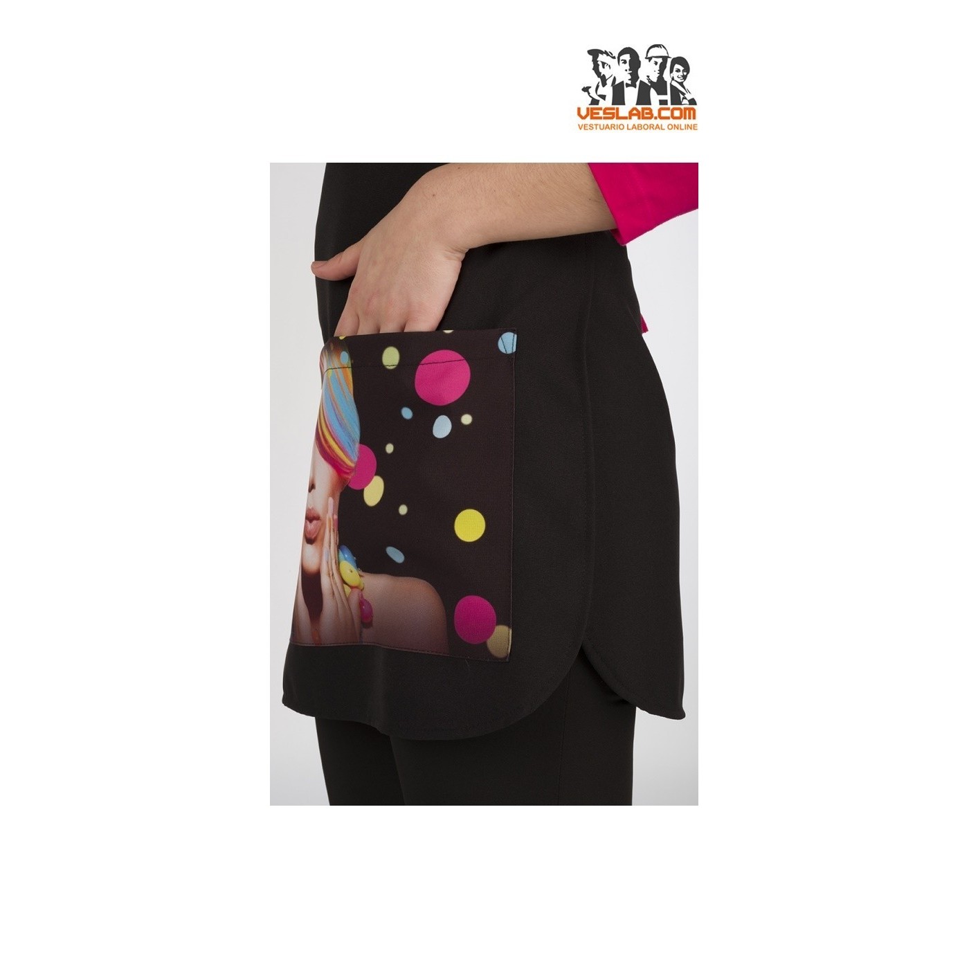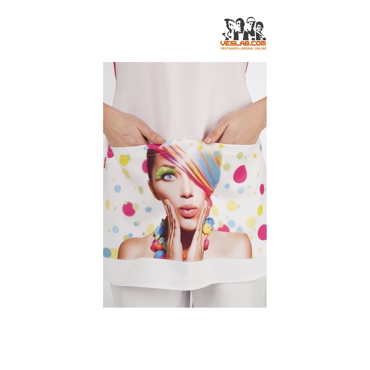 Étole serrée, encolure ronde et emmanchures polies aux couleurs vives, devant lisse avec poche centrale divisée estampée, bas arrondis, réglage de la taille avec des rubans croisés dans le dos et noués à la taille.