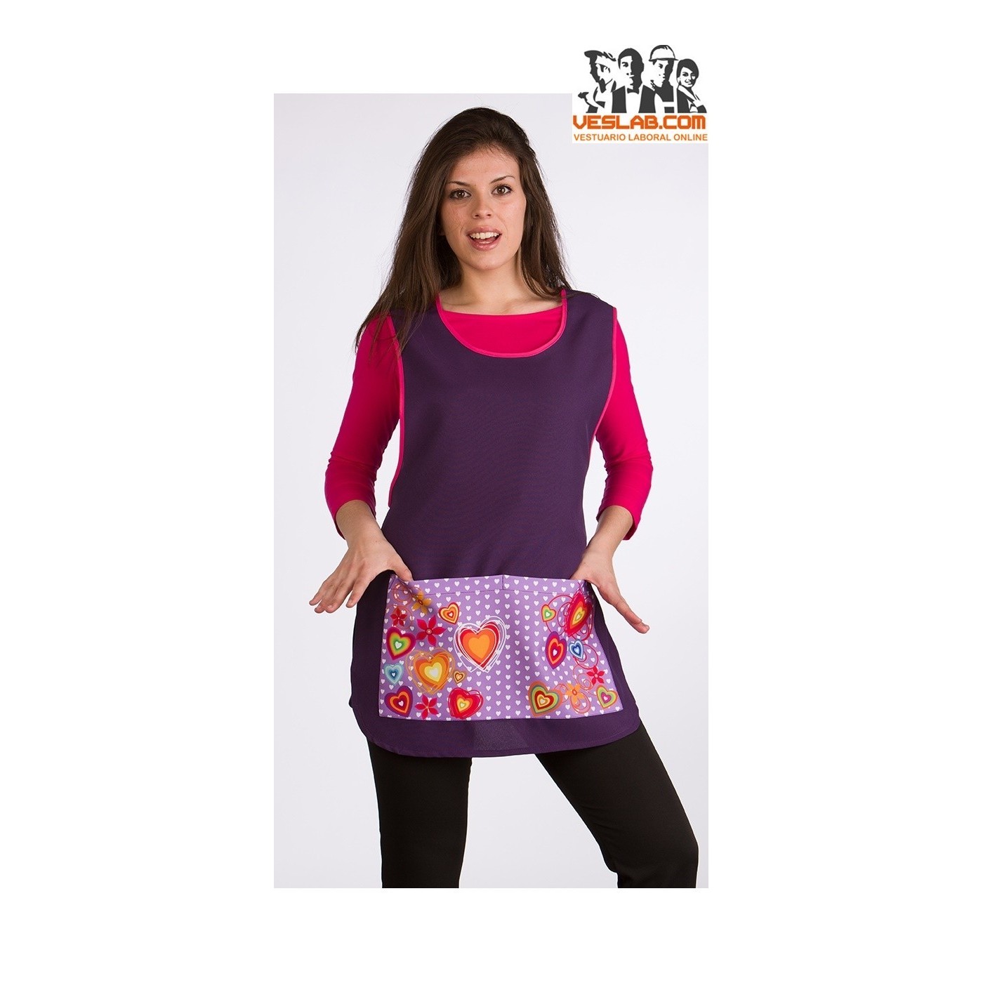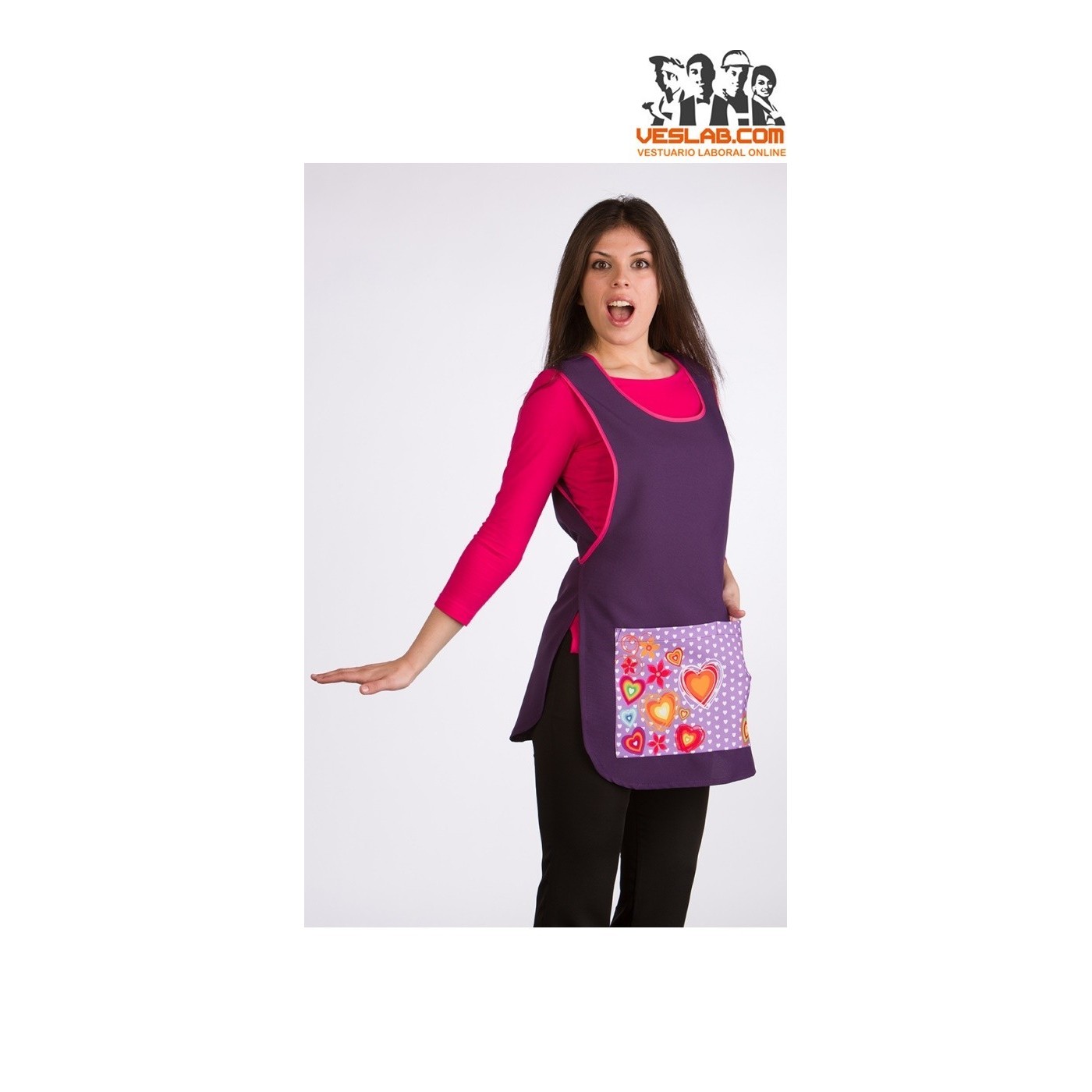Étole serrée, encolure ronde et emmanchures polies aux couleurs vives, devant lisse avec poche centrale divisée estampée, bas arrondis, réglage de la taille avec des rubans croisés dans le dos et noués à la taille.