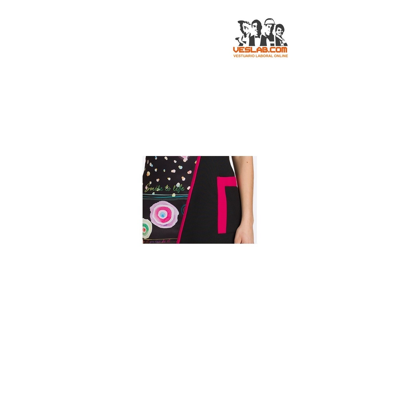 Col à volants carrés, 1 diagonale devant estampée, coutures de couleurs vives, poche double couleur, bretelles bicolores, ajustement de la taille avec des rubans colorés qui se croisent dans le dos et noués à la taille.