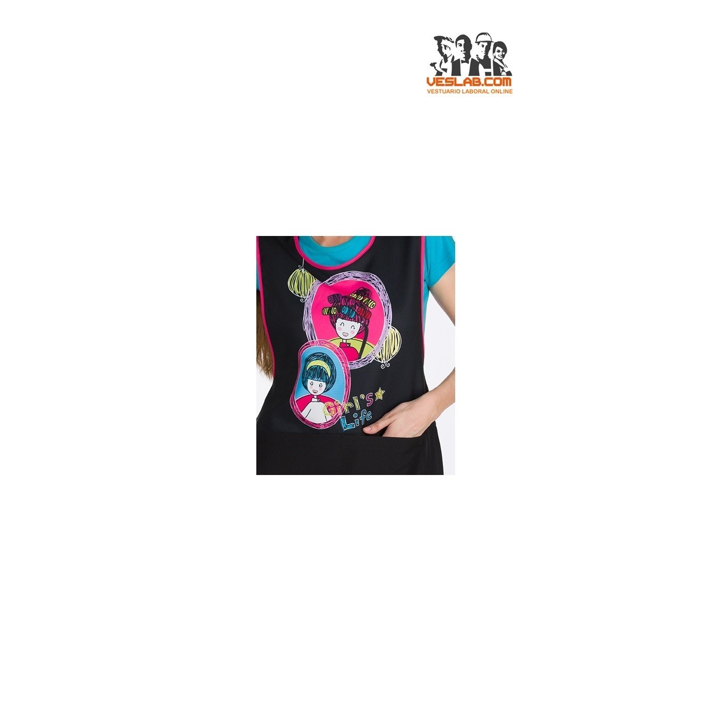 Étole serrée, col rond et emmanchures polies avec des couleurs vives, imprimé à l'avant avec un diviseur de poche central lisse, fond rond, ajustement de la taille avec des rubans qui se croisent dans le dos et sont noués à la taille. COMPOSITION: 100% POLYESTER / STRECH