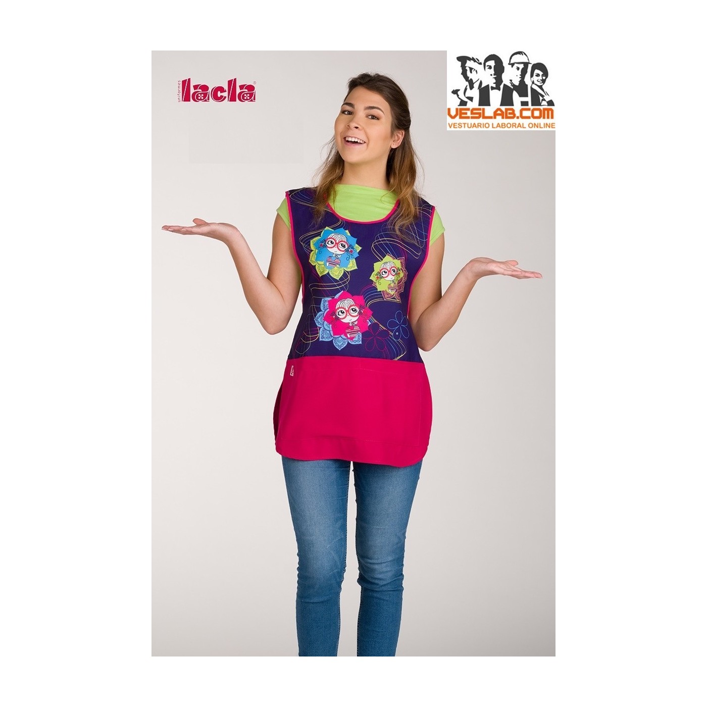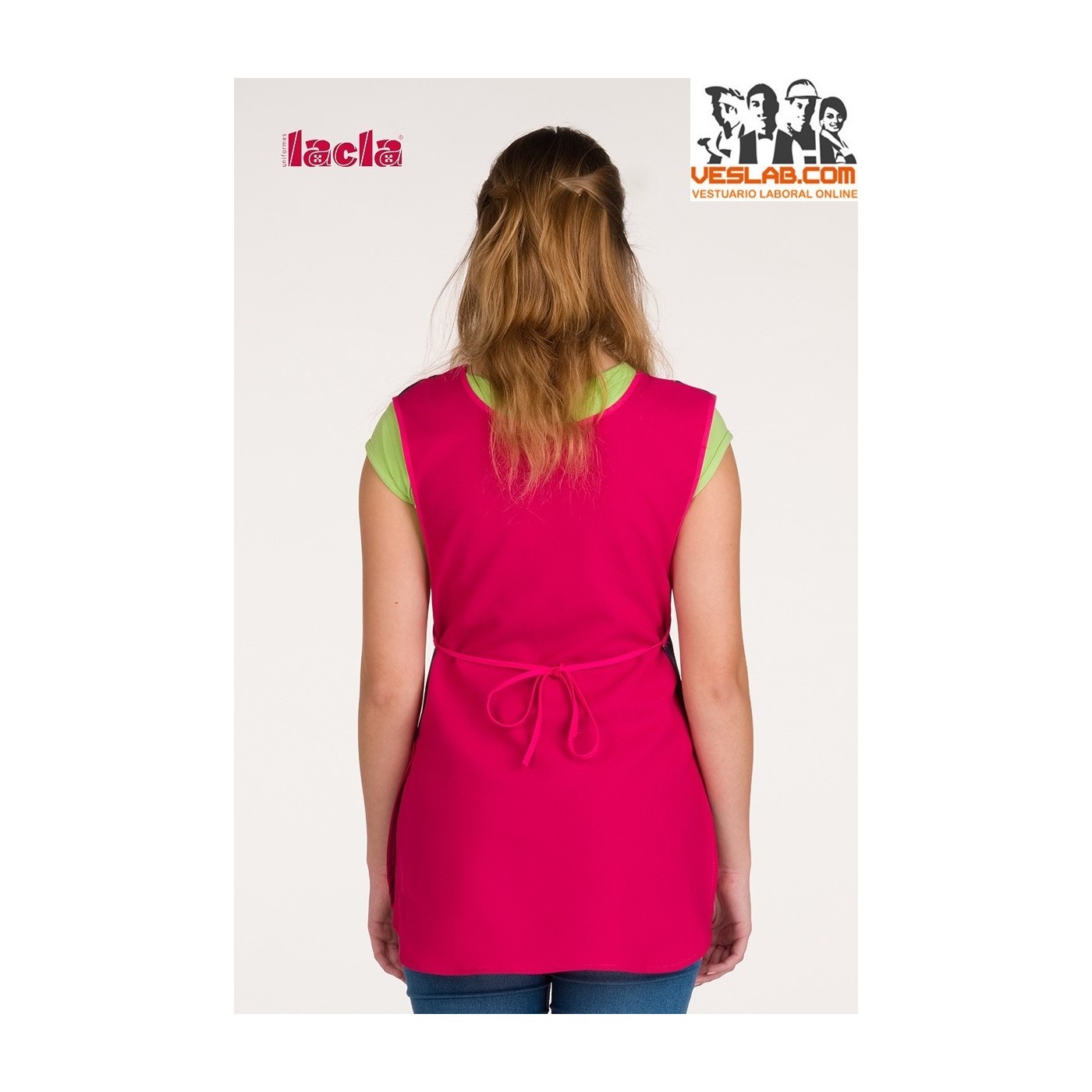 Stole bien. avec encolure ronde et emmanchures polies aux couleurs vives. devant imprimé avec une poche centrale lisse. dépressions rondes. Ajuster la taille avec des rubans qui se croisent dans le dos et nouer à la taille.