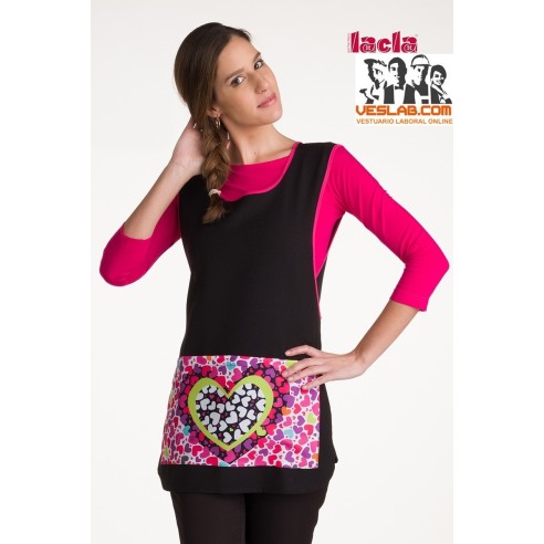 Stole bien. avec encolure ronde et emmanchures polies aux couleurs vives. Devant lisse avec poche de séparation centrale imprimée. dépressions rondes. Ajuster la taille avec des rubans qui se croisent dans le dos et nouer à la taille.