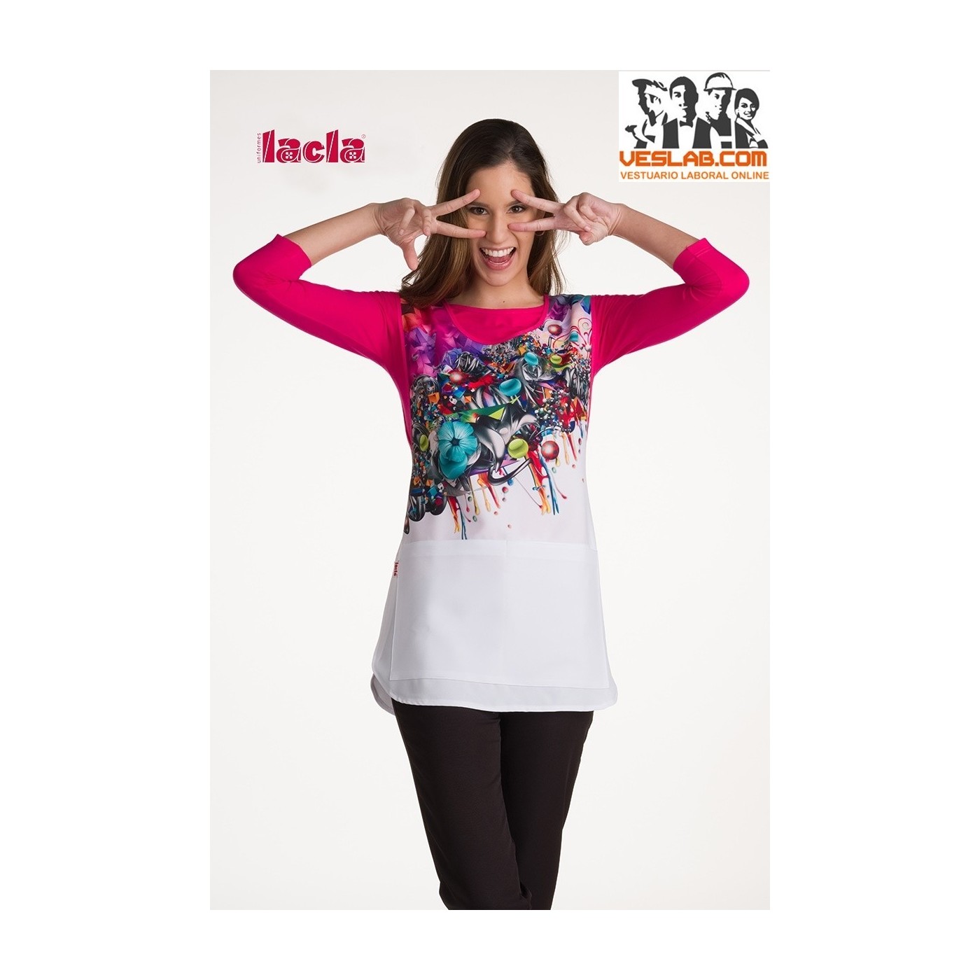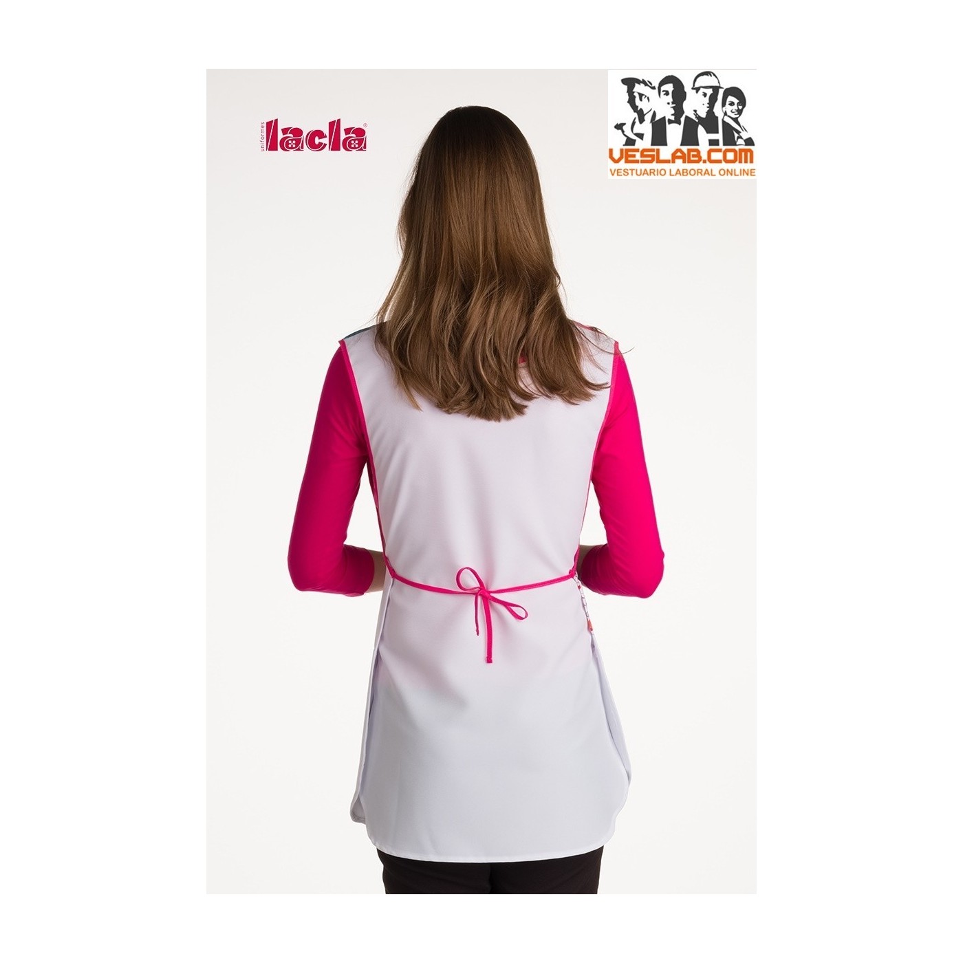 Stole bien. avec encolure ronde et emmanchures polies aux couleurs vives. devant imprimé avec une poche centrale lisse. dépressions rondes. Ajuster la taille avec des rubans qui se croisent dans le dos et nouer à la taille.