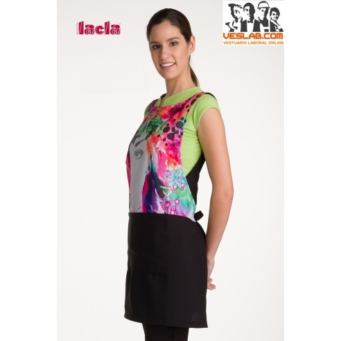 Stole avec encolure ronde. devant avec empiècement imprimé et poches plaquées. de retour avec une pince à épiler. Ajuster la taille avec des rubans qui se croisent dans le dos et nouer à la taille.