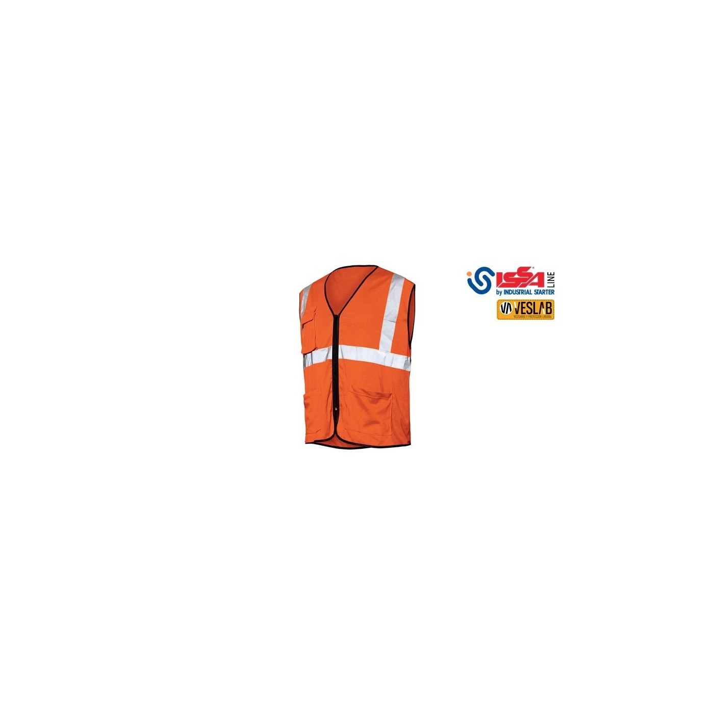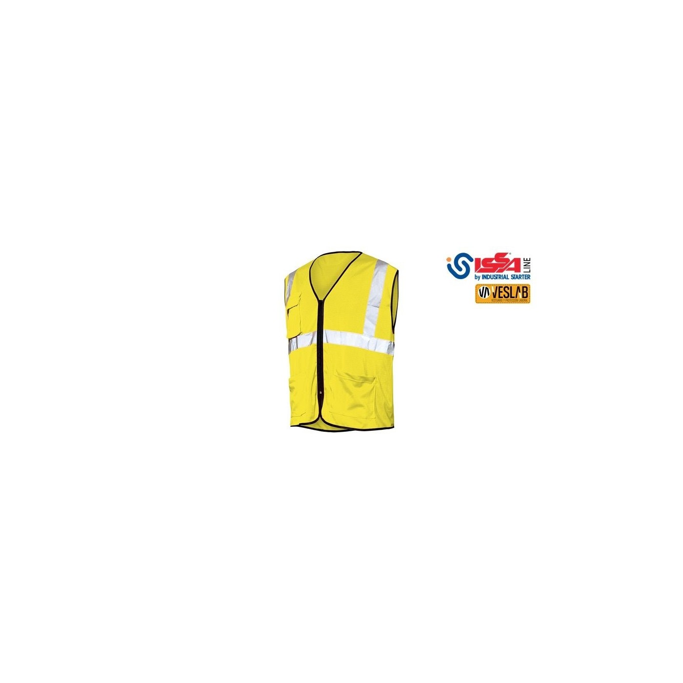 Gilet haute visibilité en tissu perforé idéal pour les saisons les plus chaudes. Il a deux poches avant et une poche mobile sur la poitrine.