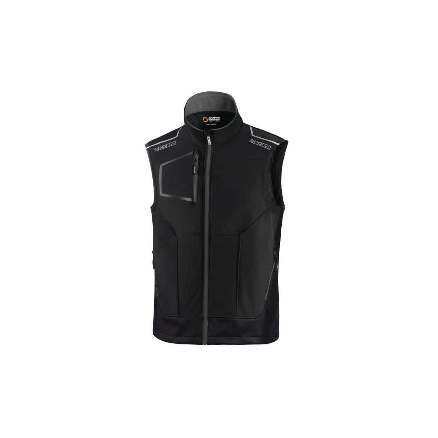Gilet technique Sparco avec tissu anti-abrasion pour renfort sur les épaules, zip central couvert et étanche et bandes réfléchissantes haute visibilité sur le dos.