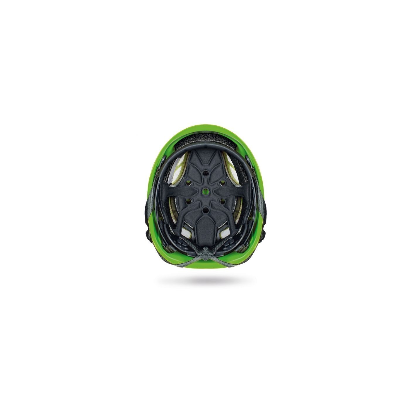 La jugulaire à quatre pointes est croisée à l'arrière pour mieux fixer le casque à la tête. Le système de déverrouillage de sécurité permet la fixation rapide et l'ouverture du mécanisme de verrouillage conformément à la norme EN 12492. Fourni avec un diviseur latéral pour ajuster la longueur des sangles.