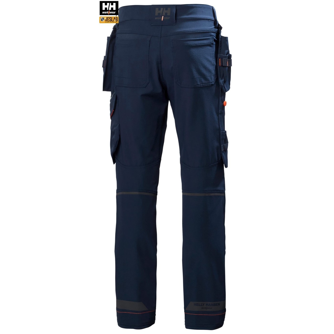 Le tissu extensible dans les 4 sens en combinaison avec Stretch Cordura® comme renfort donne au pantalon un look moderne et épuré. Des bandes réfléchissantes derrière les genoux et au bas du pantalon assurent une visibilité à 360 degrés dans l'obscurité. Les pantalons de construction ont des poches suspendues amovibles qui permettent de les laisser dans la voiture lorsque vous avez fini de travailler ou après une tâche d'utilisation spécifique.