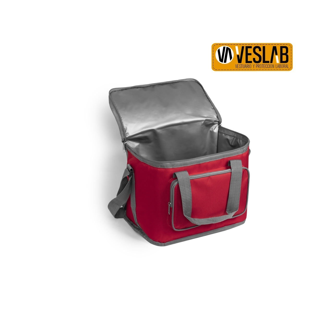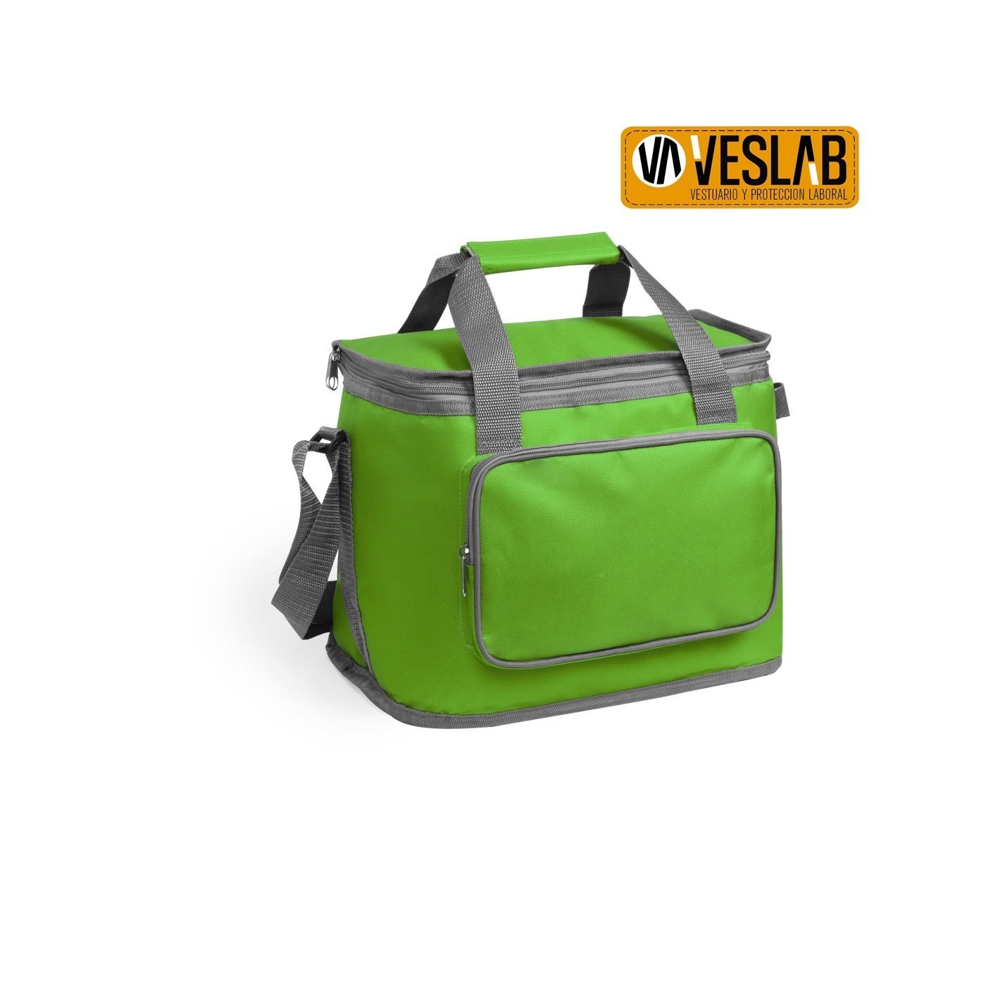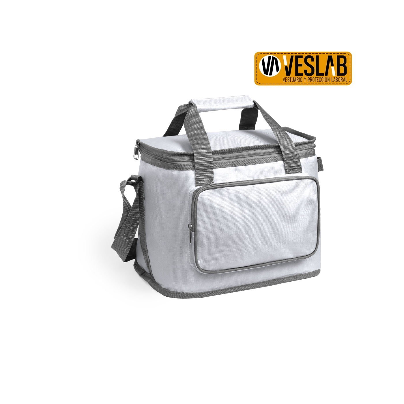 Réfrigérateur en polyester 600D robuste avec intérieur en PEVA sans BPA. Fermeture zippée avec grande poche avant, poignées en nylon renforcées et bandoulière réglable. Disponible dans une large gamme de couleurs, avec détails et accessoires en gris.