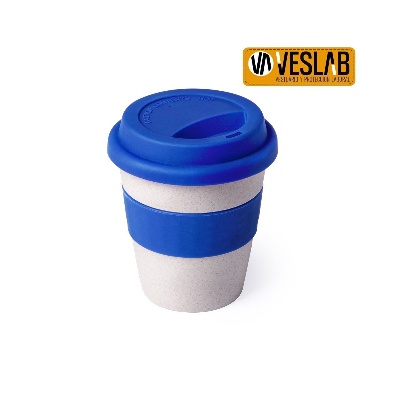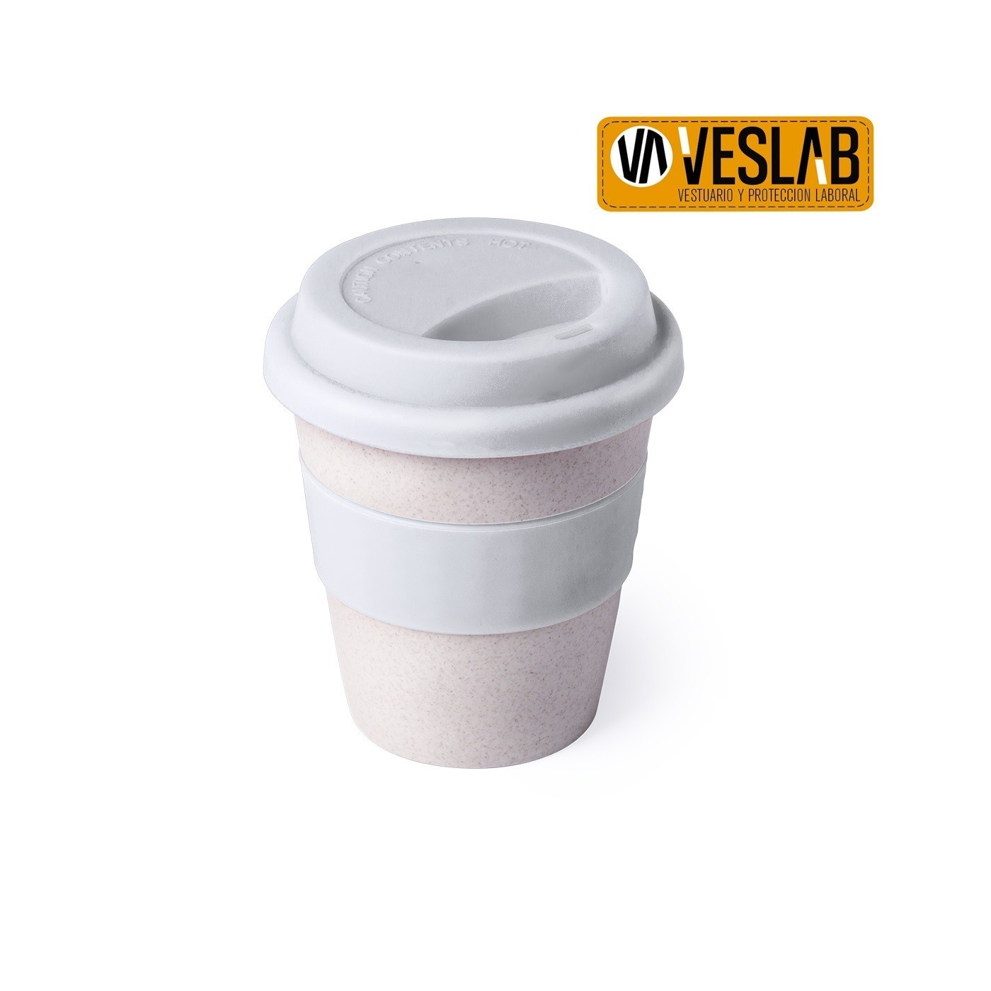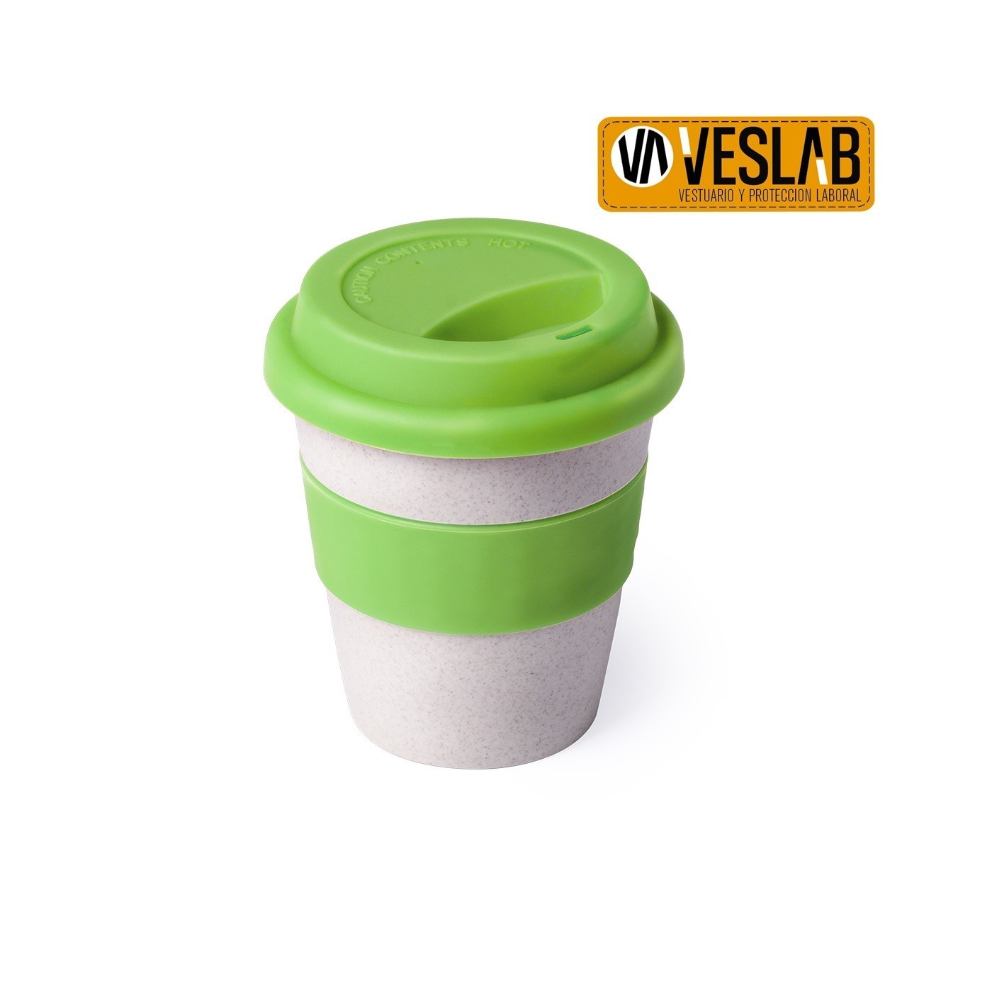 Verre nature en fibre de bambou. 380 ml de capacité, avec un corps brut. Bande anti-brûlure et capuchon en silicone assorti de différentes couleurs, avec capuchon doseur de sécurité.