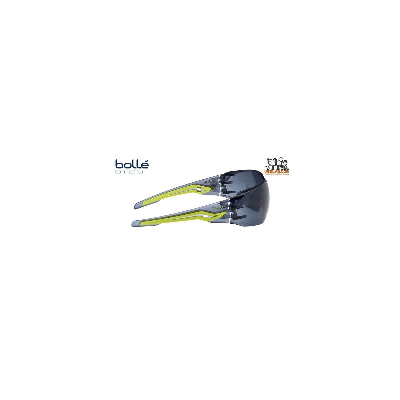 Lunettes de sécurité lentille fumée Bollé Safety Silex. Il se distingue comme des lunettes de protection avec une monture très enveloppante. Lunettes à branches confortables avec composant PC / TPR bimatière.