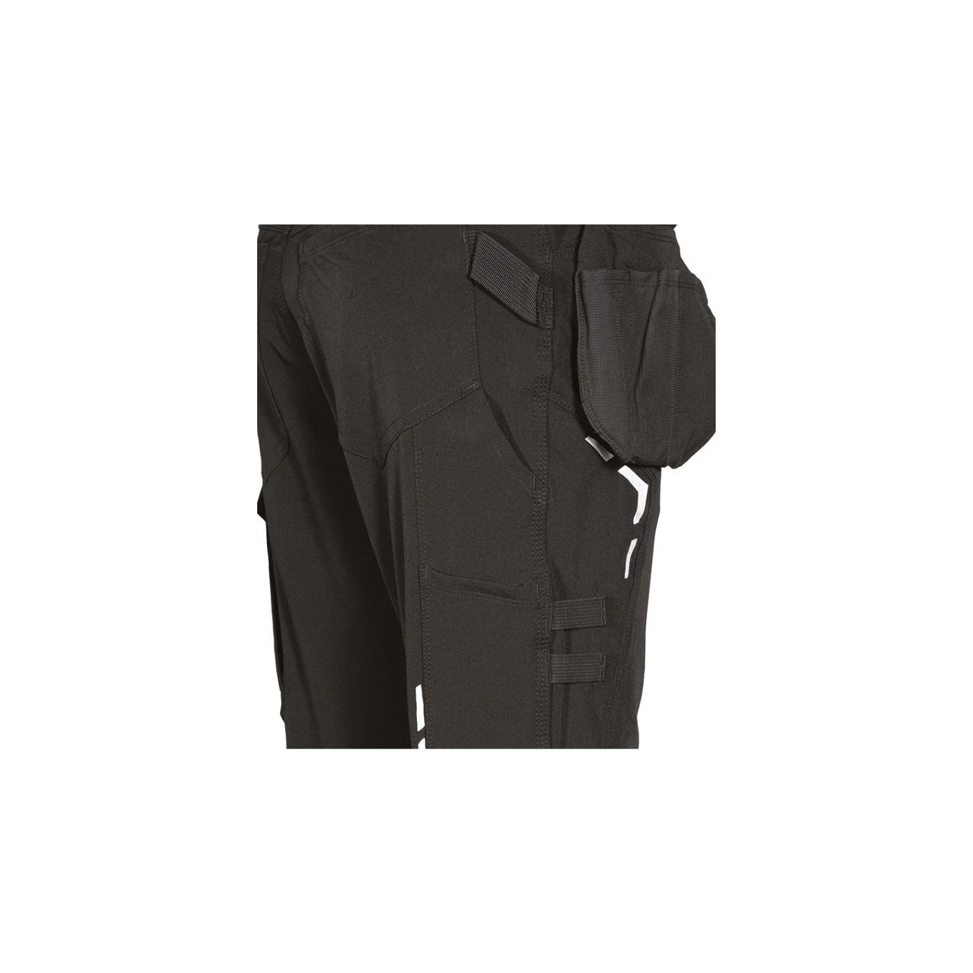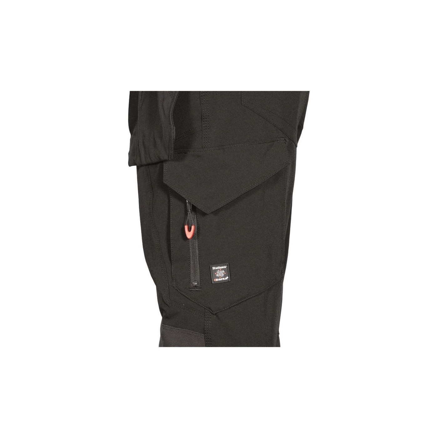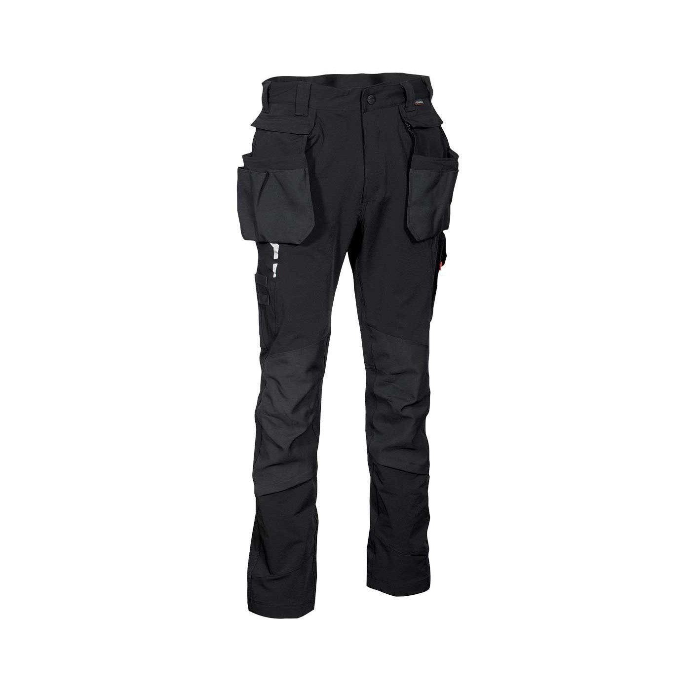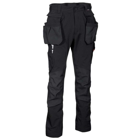 DESCRIPTION: 2 poches larges à l’avant, double poche postérieure fermeture avec velcro, inserts réfléchissants, jambes et genoux à coupe ergonomique, passant porte-marteau, poche latérale à double ouverture (fermeture avec velcro et zip), poche pour mètre pliant, poches extérieures porte-ongles en nylon, détachables avec le zip, poches pour les genouillères en nylon ajustables, tissu élastique