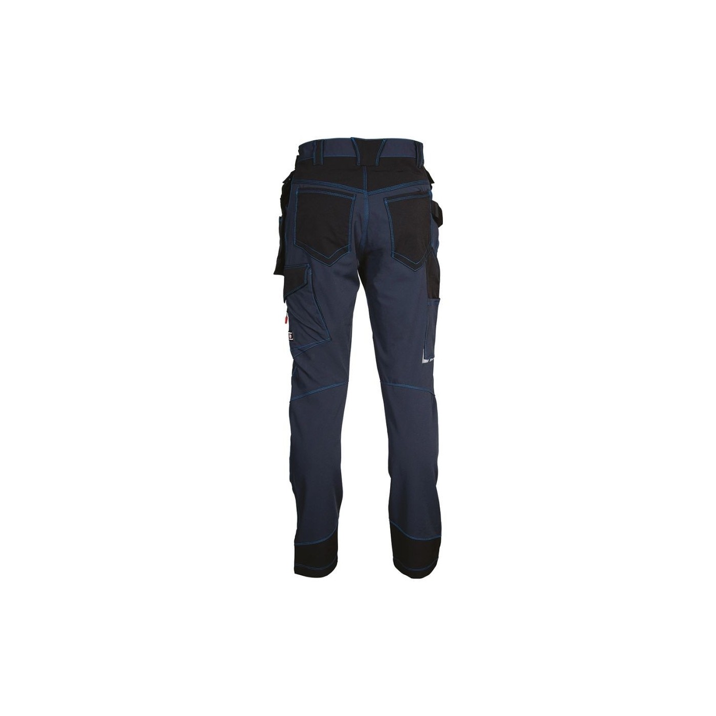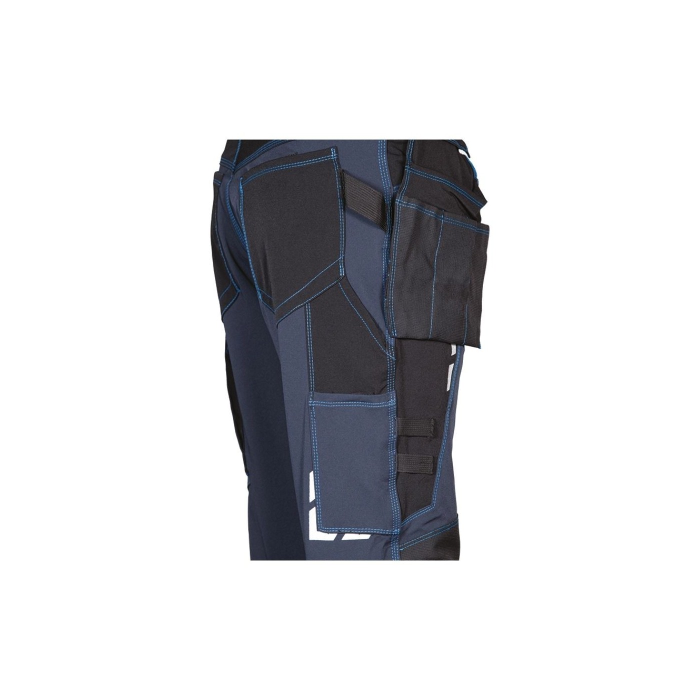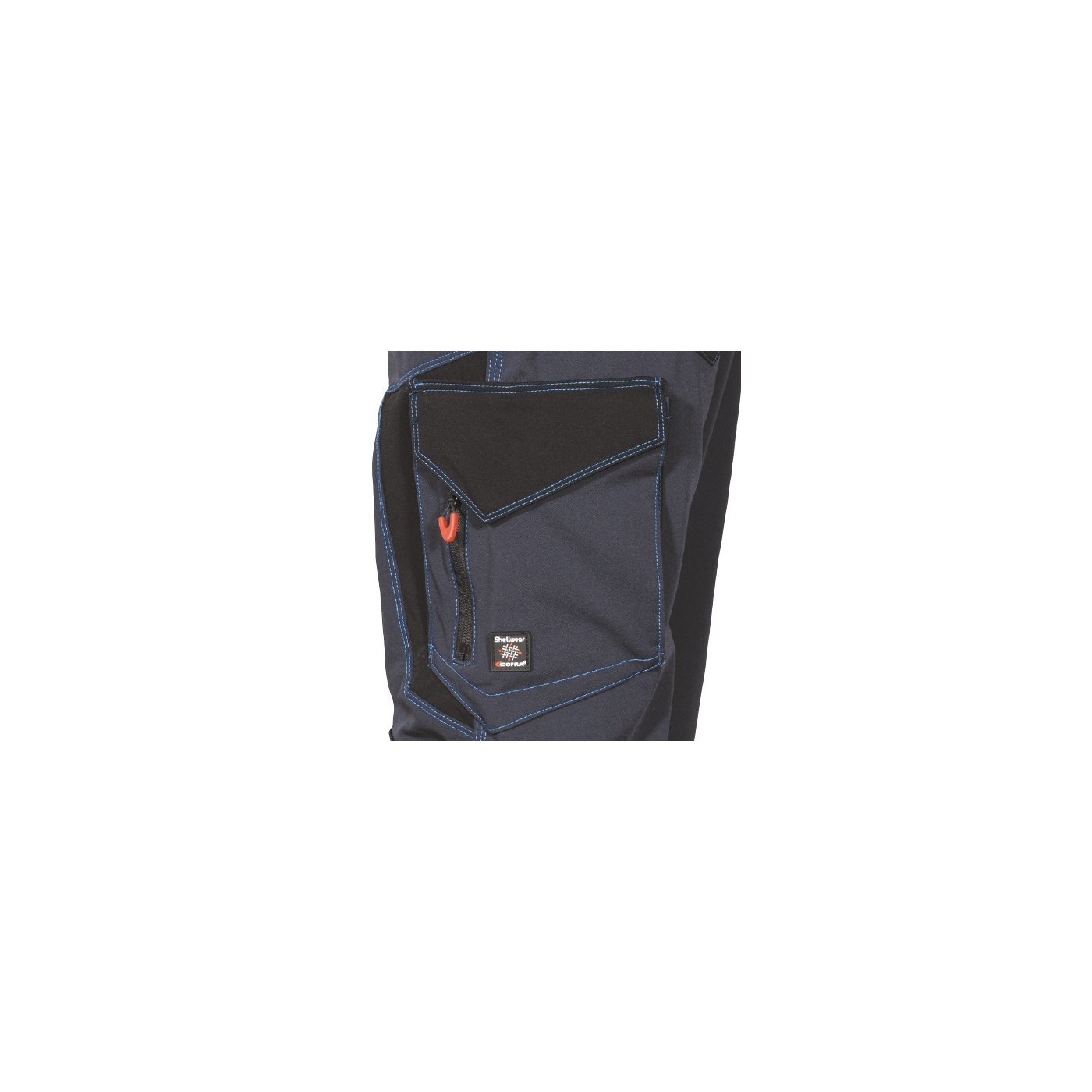 DESCRIPTION: 2 poches larges à l’avant, double poche postérieure fermeture avec velcro, inserts réfléchissants, jambes et genoux à coupe ergonomique, passant porte-marteau, poche latérale à double ouverture (fermeture avec velcro et zip), poche pour mètre pliant, poches extérieures porte-ongles en nylon, détachables avec le zip, poches pour les genouillères en nylon ajustables, tissu élastique