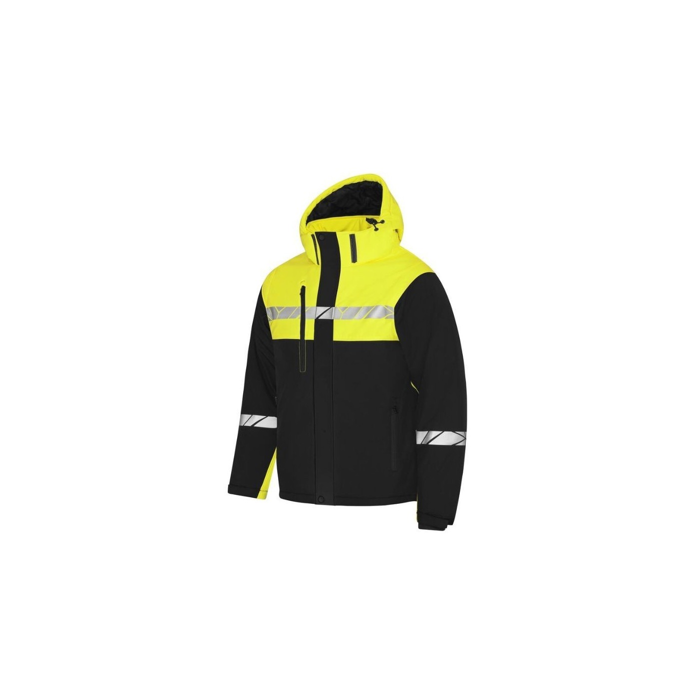La veste matelassée 9910-VIS Projob offre imperméabilité, protection coupe-vent et haute visibilité EN 17353, conçue en 100 % polyester recyclé avec plusieurs poches pratiques.