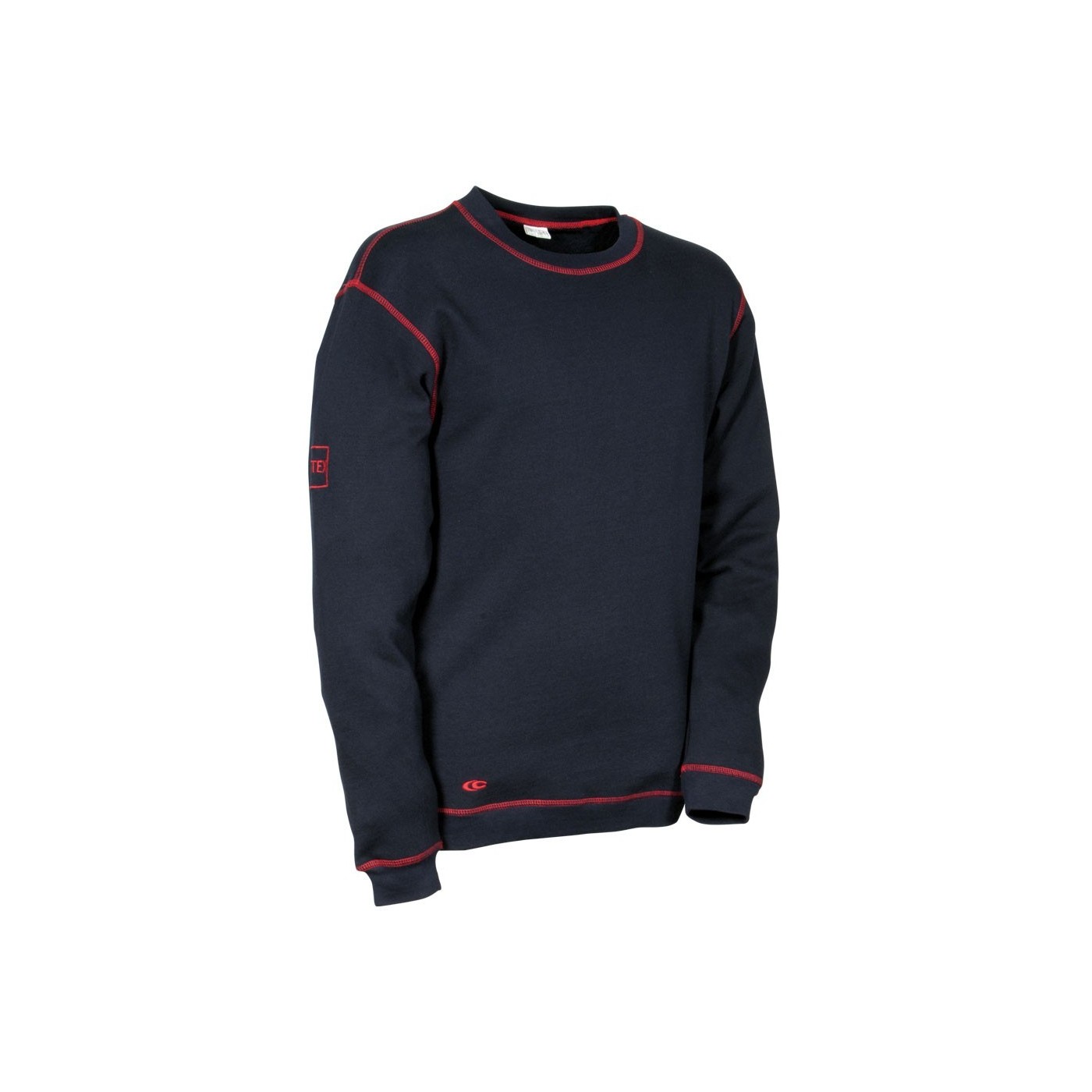 Sweat en tissu ignifuge avec bas de vêtement et manches élastiquées, broderie « ATEX » sur la manche droite, pictogrammes brodés sur la manche gauche, recommandé pour les zones ATEX et aussi aéroports, ignifuge, industrie, métallurgie et sidérurgie, plates-formes off -sociétés pétrolières côtières, etc...